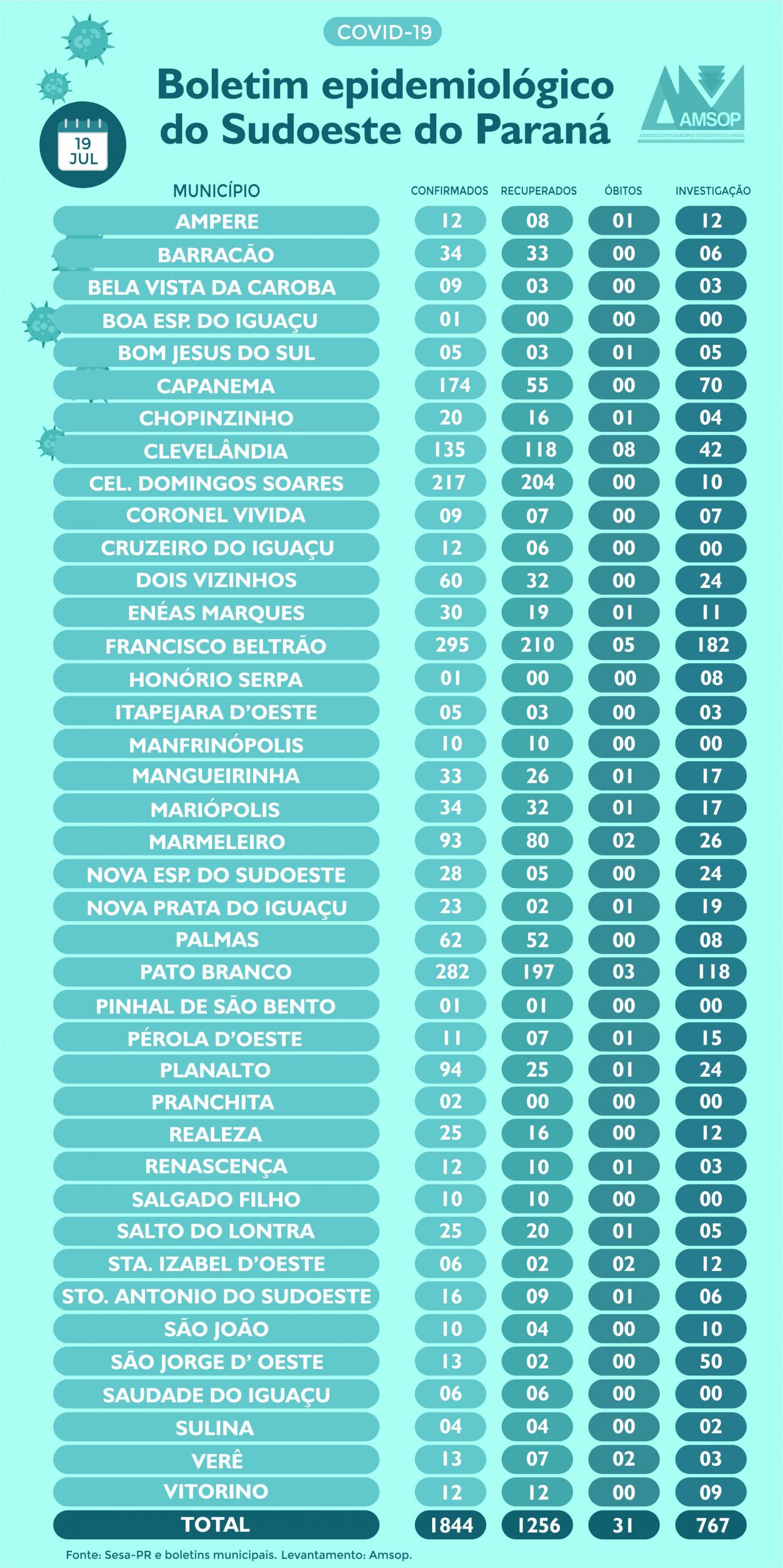 No Sudoeste, 1844 pessoas testaram positivo para Covid, mas 1256 já estão curadas, segundo os dados coletados ontem, domingo, pela Amsop. O boletim regional é feito semanalmente com base nas informações disponibilizadas pelas prefeituras e pela Sesa e visa acompanhar a evolução da doença e nortear ações em conjunto entre municípios da região. 31 óbitos já foram registrados e outros 767 casos estão em investigação.