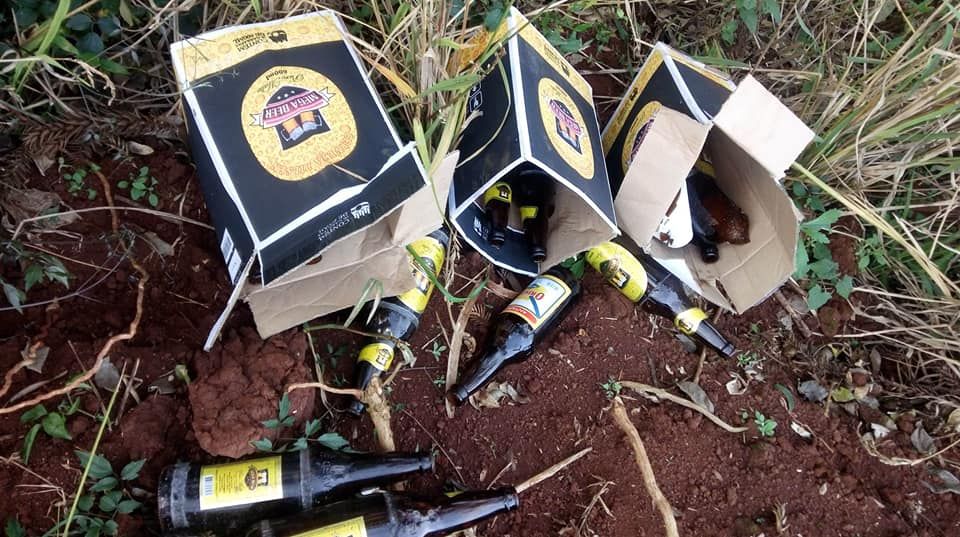 São várias caixas com cascos de garrafas de cervejas vazias, sendo que muitas delas quebrou no momento em que foi jogado.