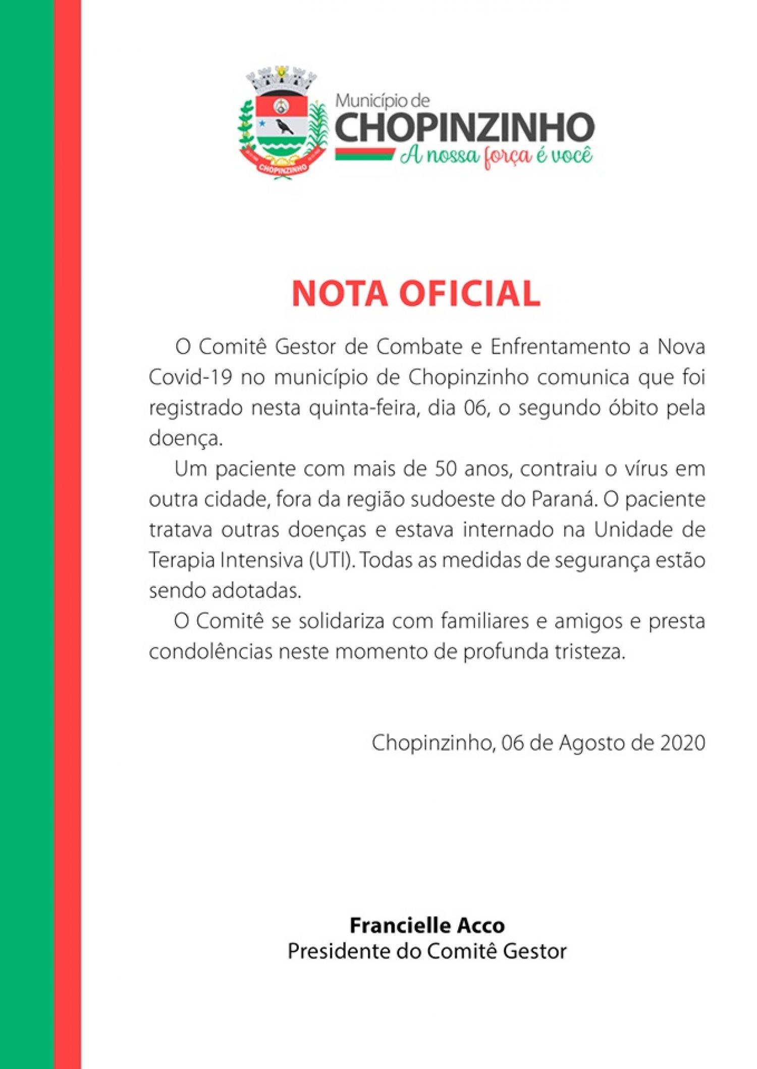 Na tarde de ontem o Comitê Municipal de Combate ao Coronavirus em Chopinzinho, divulgou nota confirmando a morte do segundo paciente de covid-19 no município.