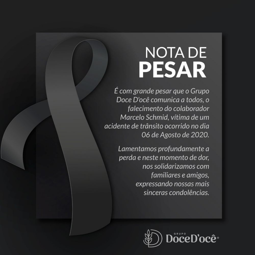 "É com grande pesar que o Grupo Doce Docê comunica a todos, o falecimento do colaborador Marcelo Schmid, vítima de um acidente de trânsito, ocorrido no dia 06 de agosto de 2020.