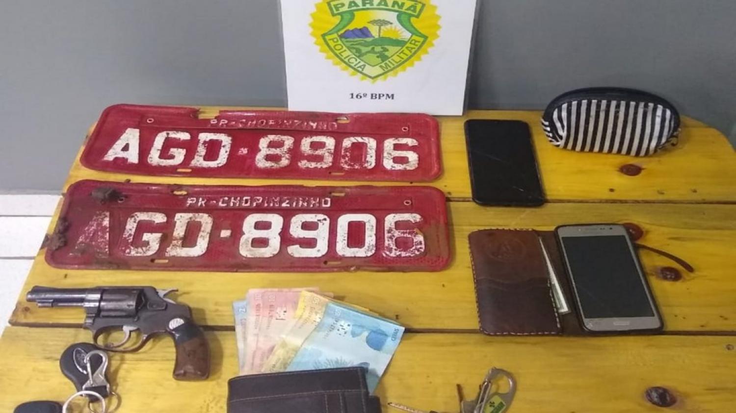 No local, a PM também encontrou duas placas de Chopinzinho, as quais seriam trocadas no veículo furtado. Também em busca na residência do suspeito, foi localizada uma arma de fogo do tipo revólver, calibre .32, carregado com três cartuchos intactos.