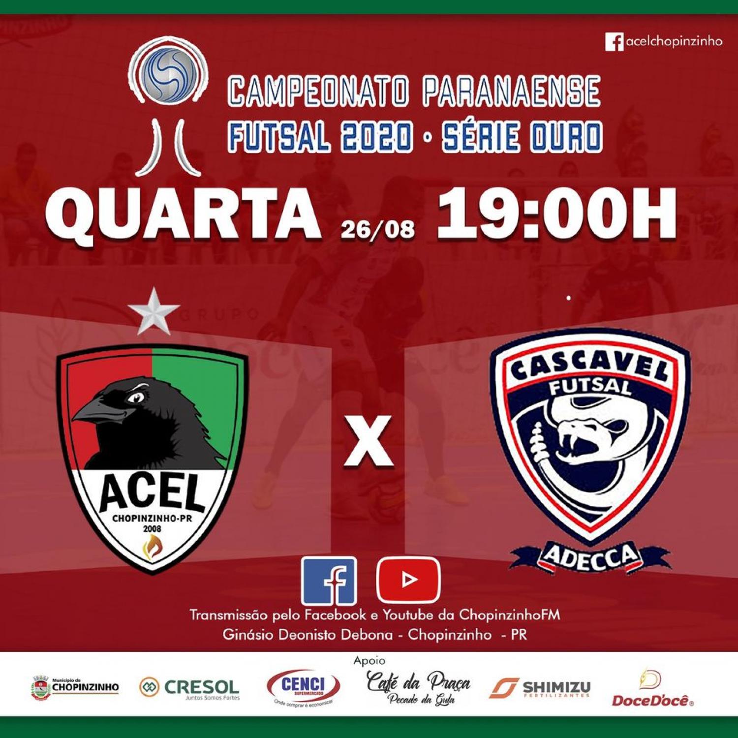 Pelo Campeonato Paranaense de Futsal, série ouro, a equipe da ACEL-Chopinzinho fará sua estreia na noite desta quarta-feira, dia 26, diante do Cascavel Futsal.