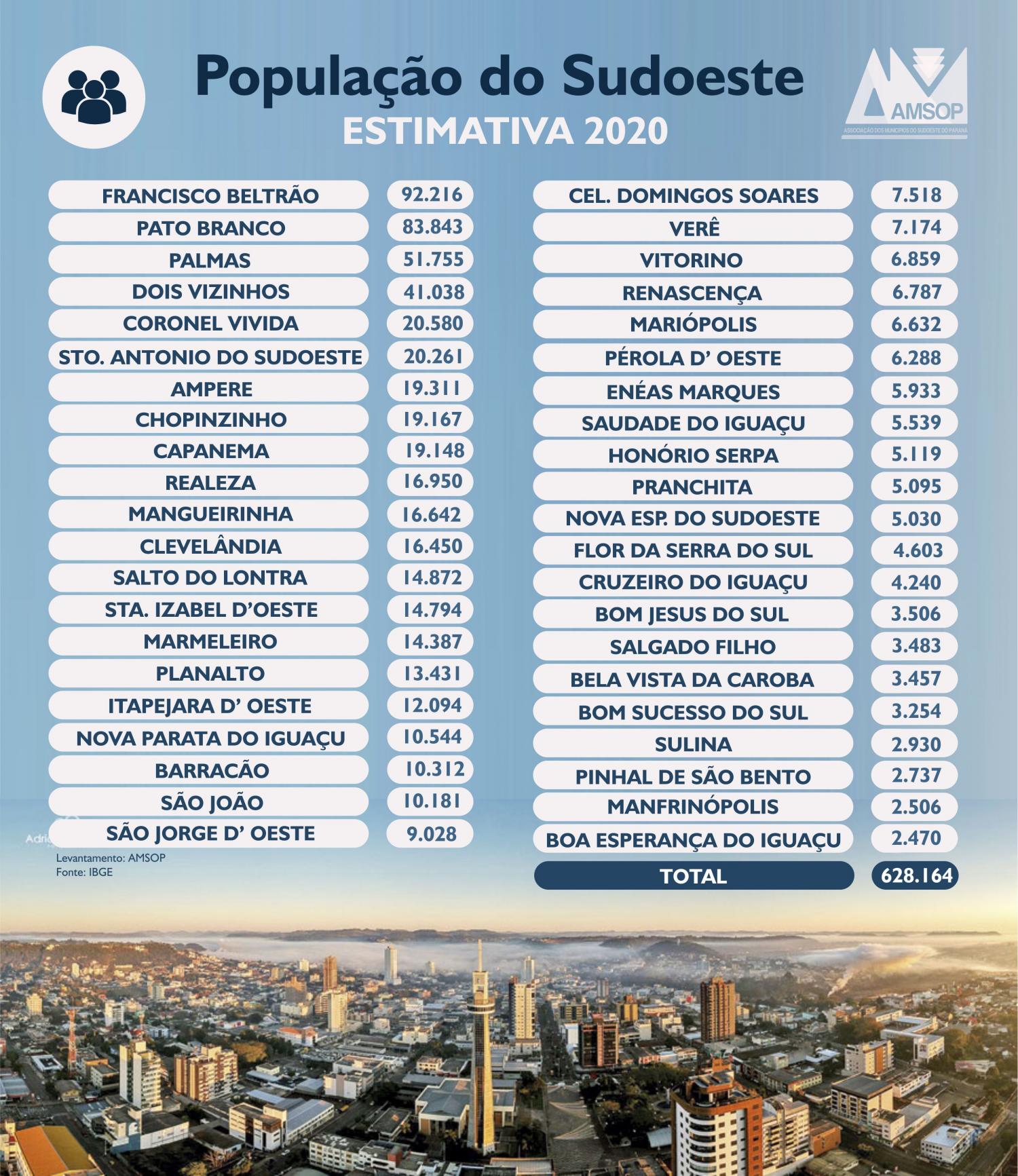 A região Sudoeste chegou aos 628.164 habitantes. É o que indica a estimativa da população divulgada na semana passada IBGE (Instituto Brasileiro de Geografia e Estatística) e que revelou crescimento no número de moradores em 18 cidades da região e queda em outras 26, segundo levantamento feito pela Amsop (Associação dos Municípios do Sudoeste do Paraná)