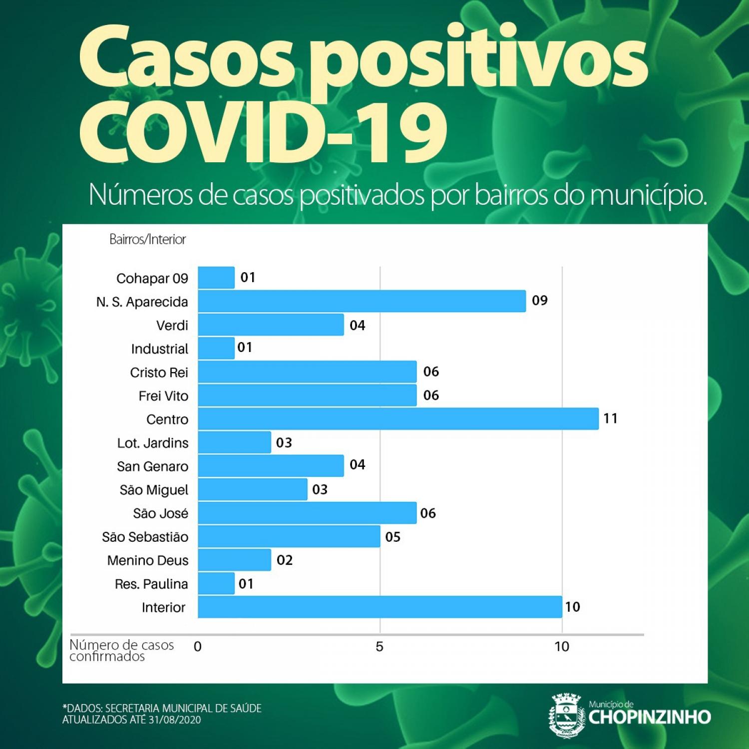 Desde o mês de abril até 31 de agosto, o município de Chopinzinho registrou 72 casos positivos de Covid-19. Nos primeiros dias de setembro já foram registrados mais 7 casos, aumentando para 79 casos confirmados no município até o momento. A área central da cidade, seguido do Bairro Nossa Senhora Aparecida registraram a maior concentração de casos, sendo 11 e 09 respectivamente. Já os bairros Frei Vito, Cristo Rei e São José, somam 06 casos cada.