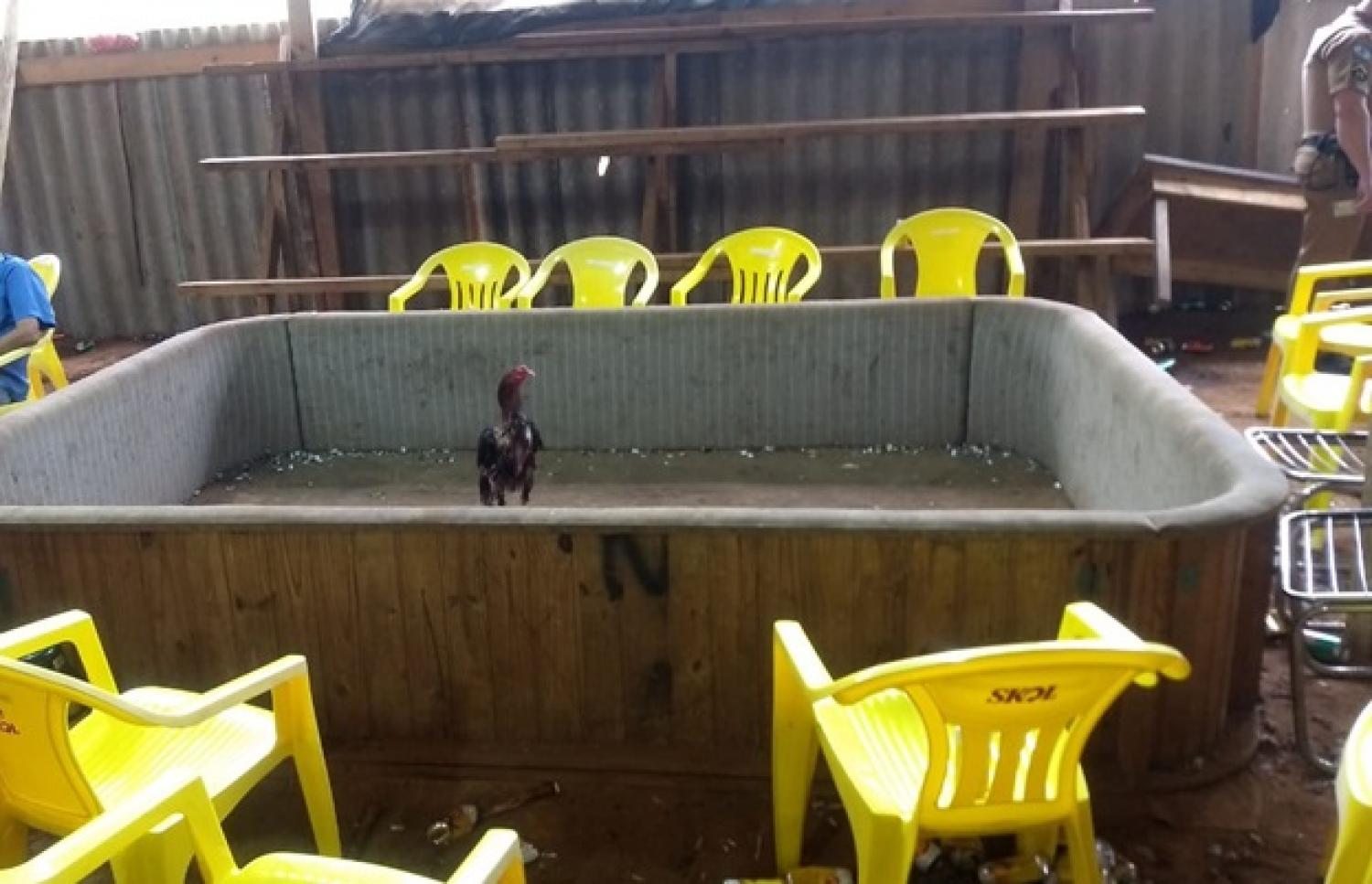 Em um galpão constatado um tambor para realização das rinhas, uma churrasqueira, um bar onde se comercializava bebidas.