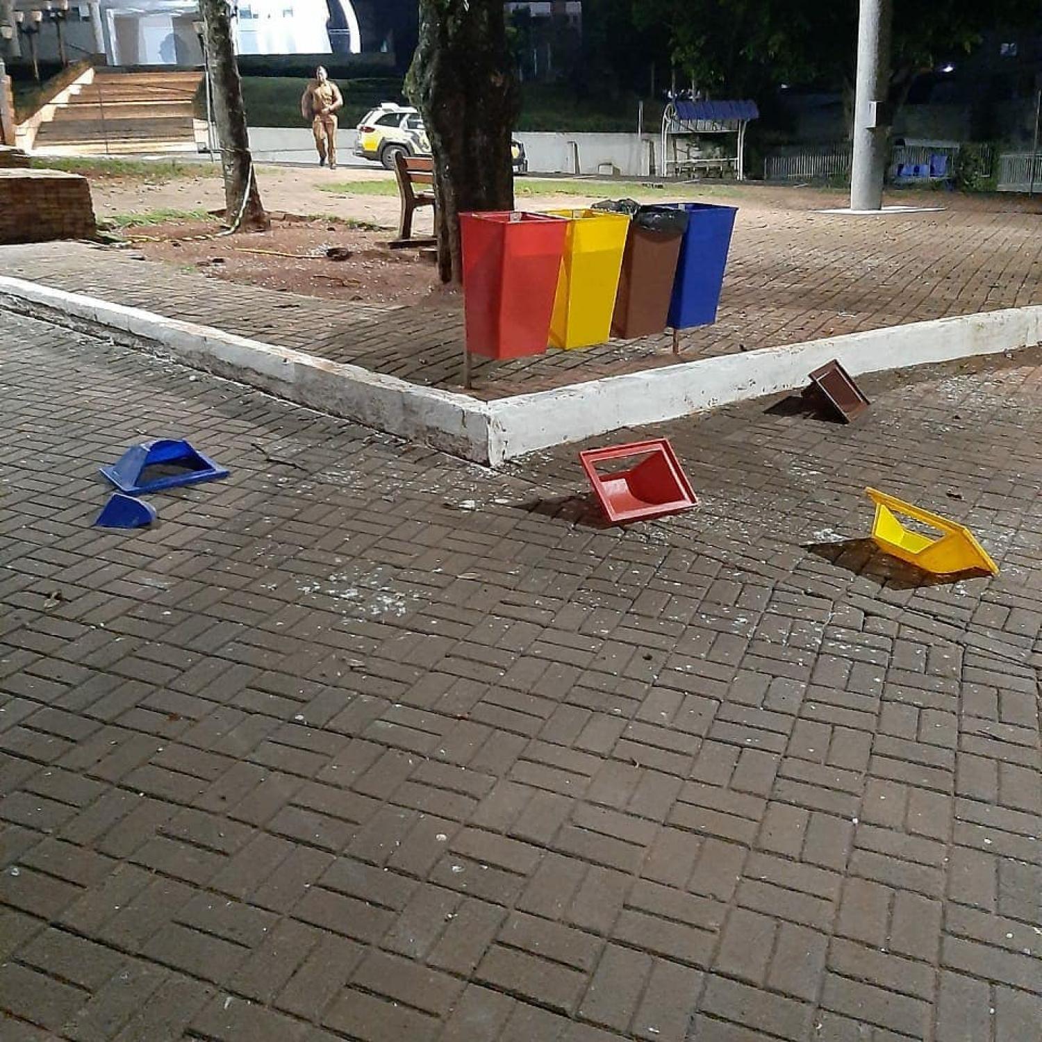 No local os policiais constataram que algumas lixeiras da praça tiveram suas tampas removidas, e uma delas estava quebrada.
