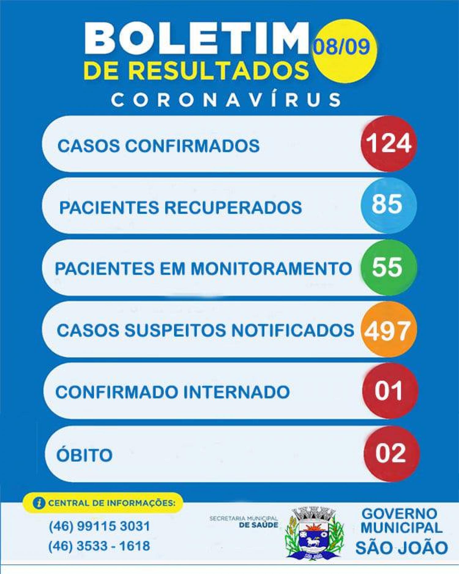 Em novo boletim divulgado na tarde desta terça feira, dia 08, foi confirmado no município de São João mais 19 casos de coronavirus, elevando o total para 124 casos confirmados.