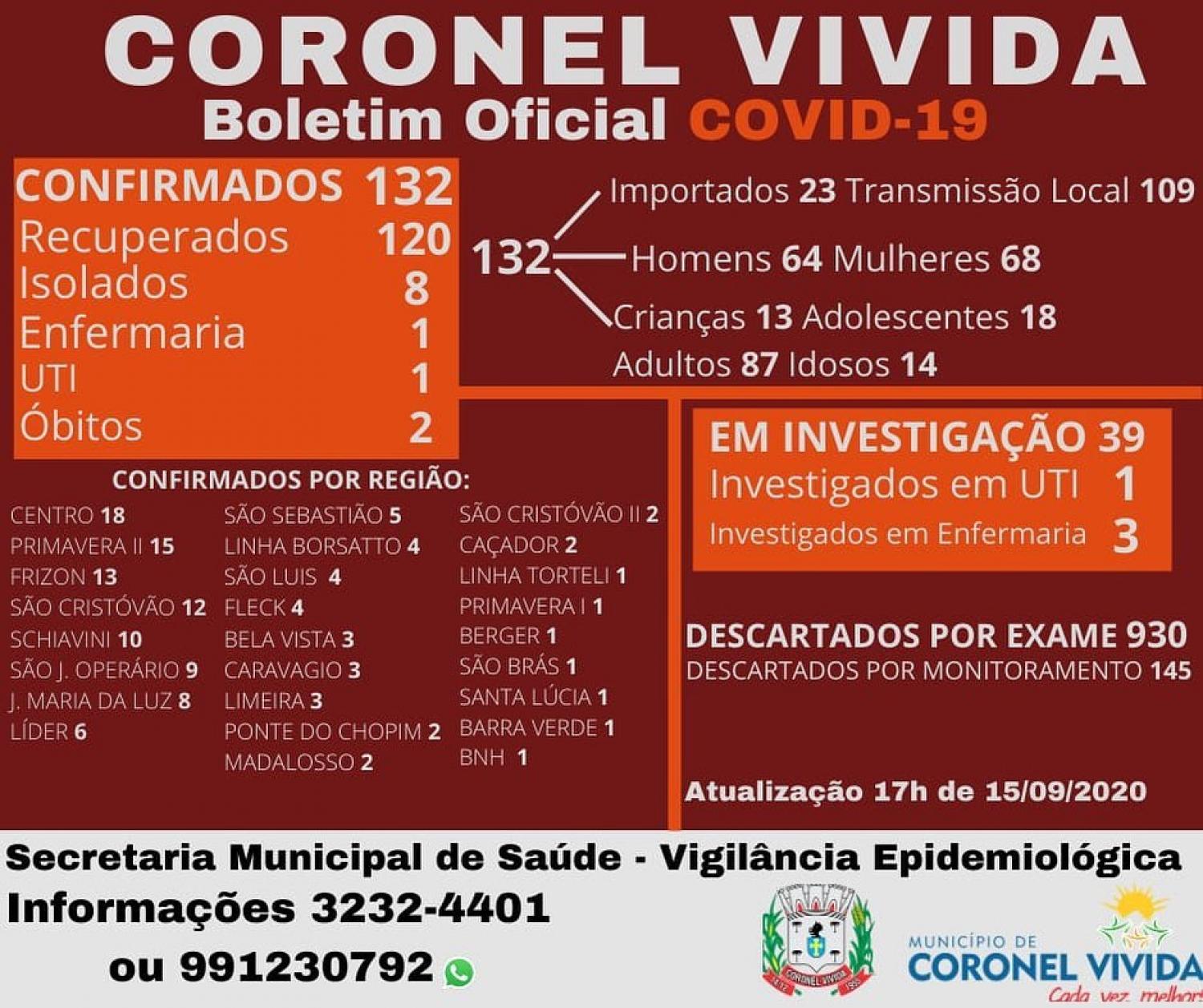 A Secretaria Municipal de Saúde de Coronel Vivida divulgou o novo boletim para esta terça-feira (15), somando mais um caso aos confirmados de covid-19. Agora são 132 positivos no município.