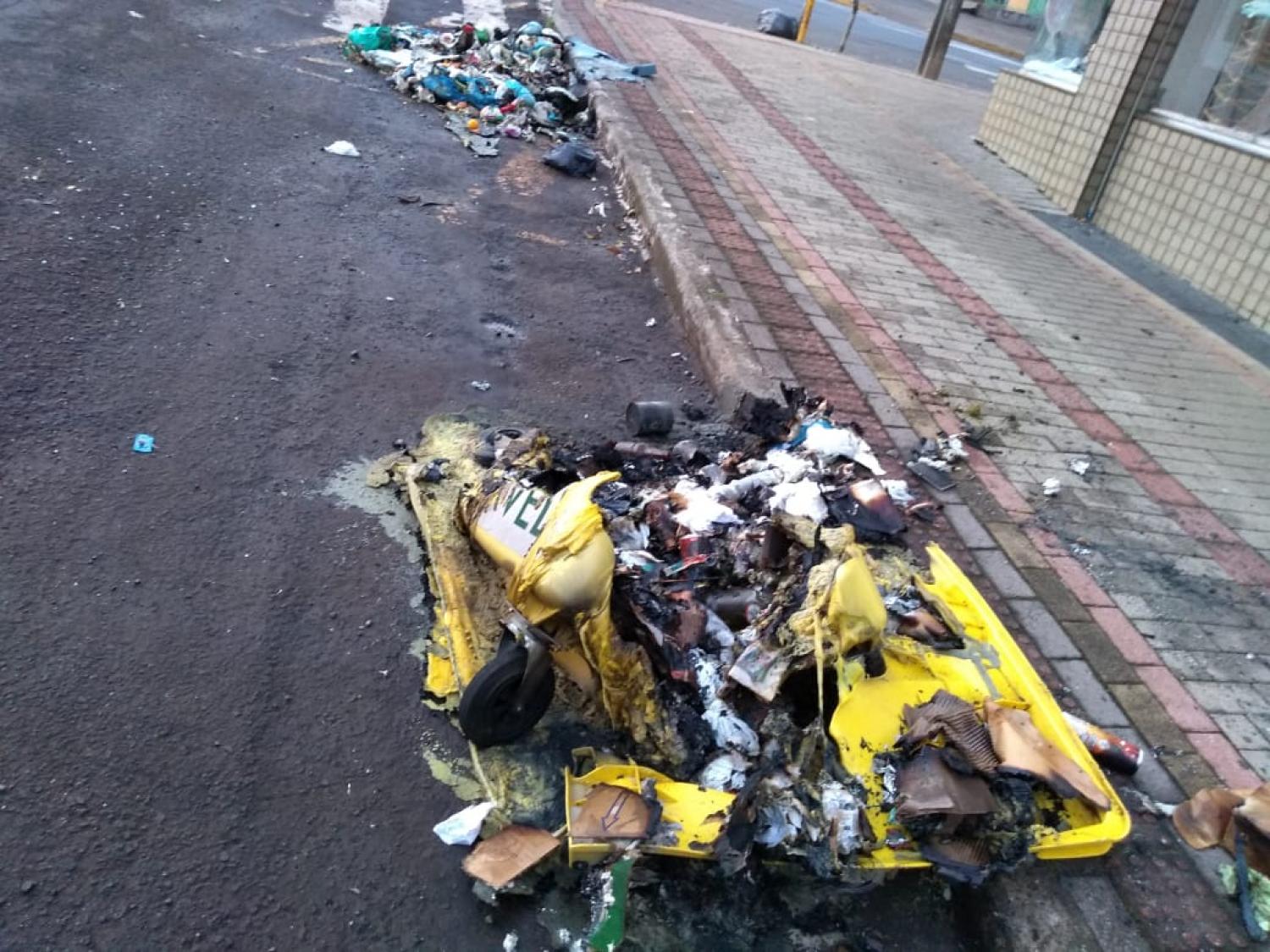 Os coletores, um de lixo orgânico e o outro de reciclável, foram completamente destruídos. A secretaria municipal de Meio Ambiente vai providenciar a limpeza e fazer o Boletim de Ocorrência na polícia.