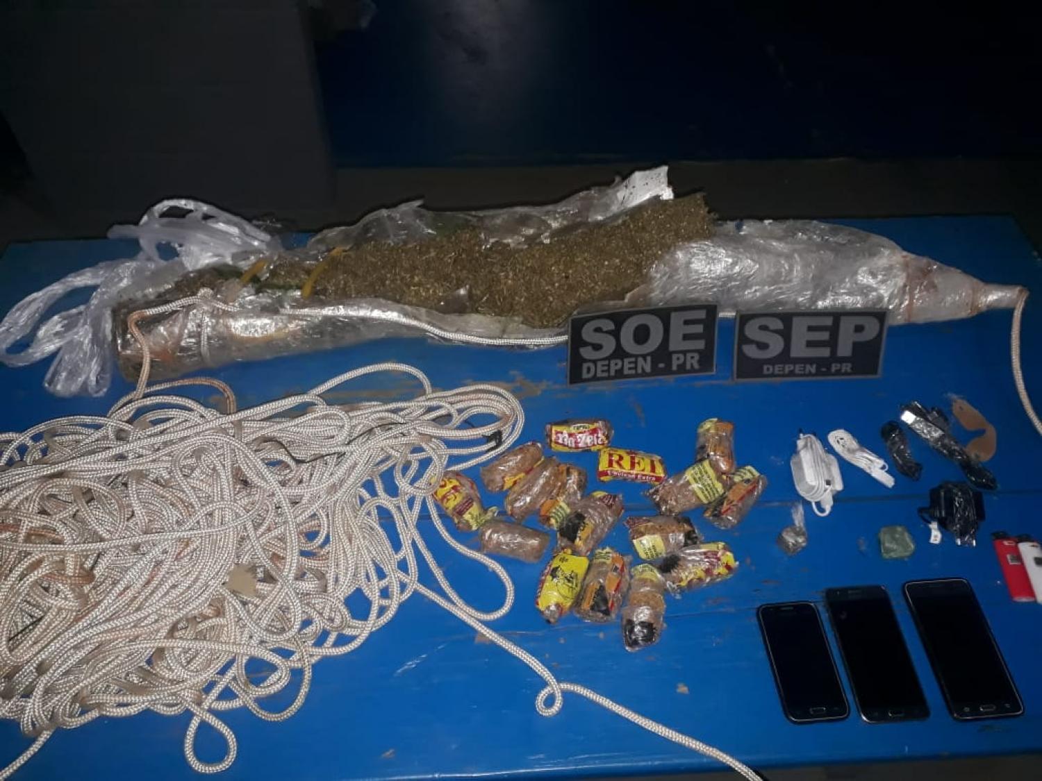 Entre os objetos apreendidos foram localizados certa quantia de maconha, aparelhos celulares, carregadores, fones de ouvido, dois isqueiros, um cabo universal, duas borrachas de soro, que são usadas para fazer estilingue, um pedaço de couro e 16 pacotes de fumo.