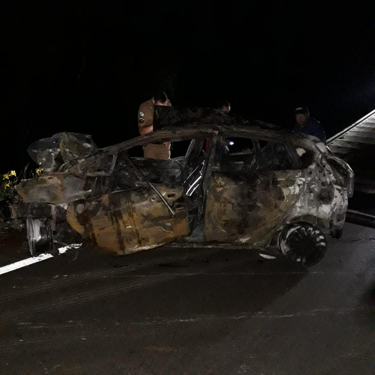 Ainda de acordo com a polícia, após cometer o crime, o homem fugiu do local em um veículo Ford/Fiesta e cerca de 10 minutos depois na PR-281 entre Santa Izabel do Oeste e Salto do Lontra, acabou batendo contra uma árvore, onde o carro pegou fogo e o condutor morreu carbonizado.