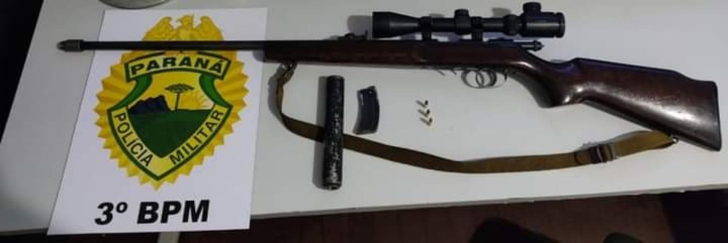 Em revista no veículo, foi encontrado atrás dos bancos uma arma de fogo do tipo Foble Calibre .22, marca CBC com luneta e um silenciador, sendo que haviam 03 munições marca CBC, duas no carregador e uma na câmara da arma.