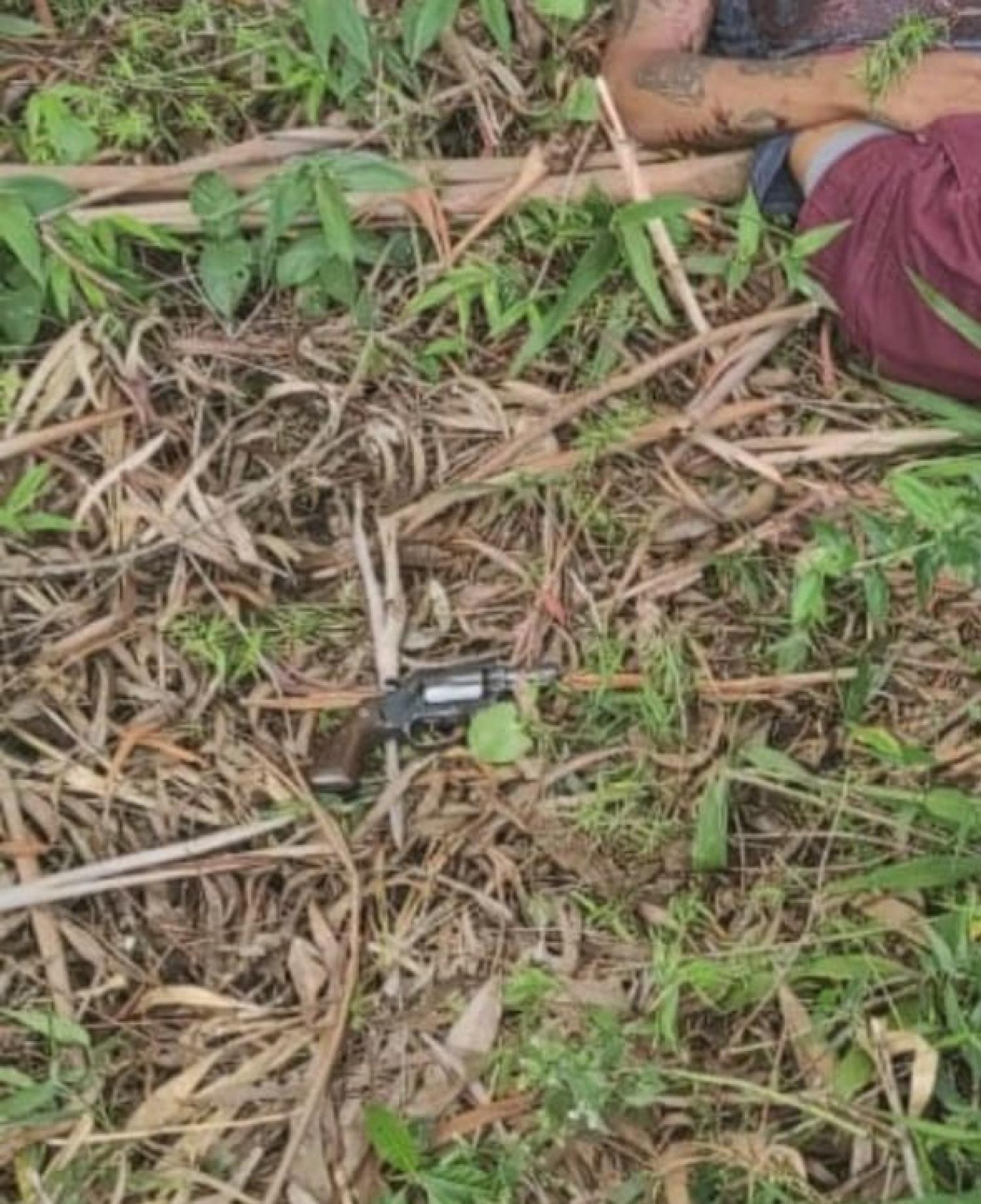 O indivíduo saiu do carro, portando um revólver, e fugiu em meio a mata às margens da rodovia. A equipe policial militar encontrou o elemento próximo ao local da fuga, sendo dado voz de abordagem, porém o suspeito efetuou disparos contra os policiais ainda na viatura.