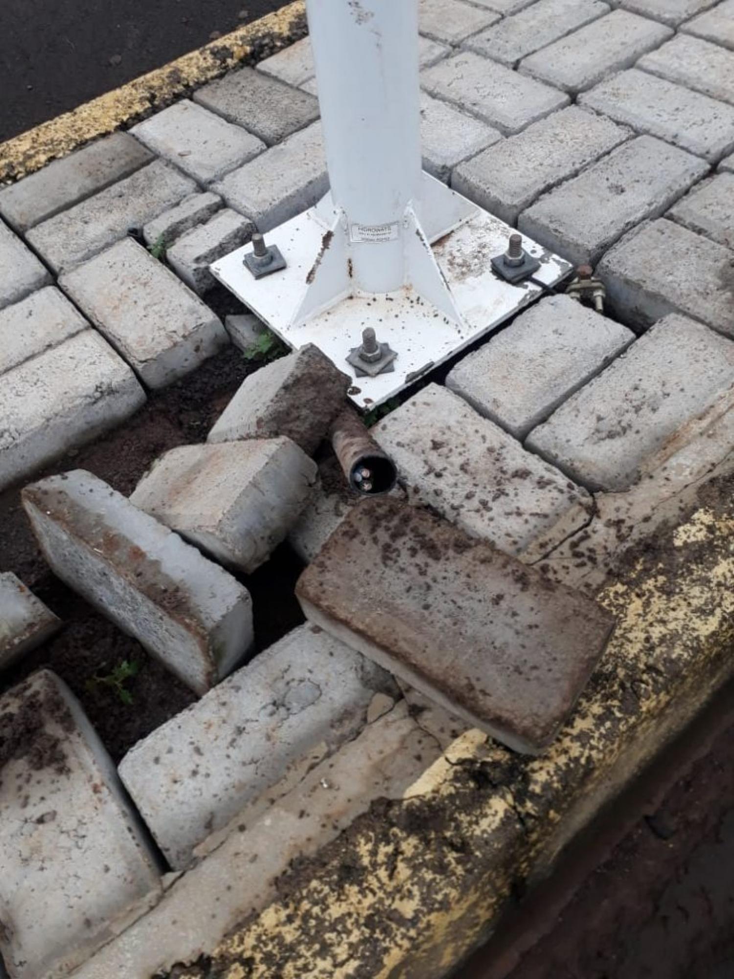 Além da fiação furtada, várias lâmpadas foram quebradas e as grades de bocas de lobo arrancadas e levadas. Com a retirada dos fios o canteiro central de Pavers ficou danificado.