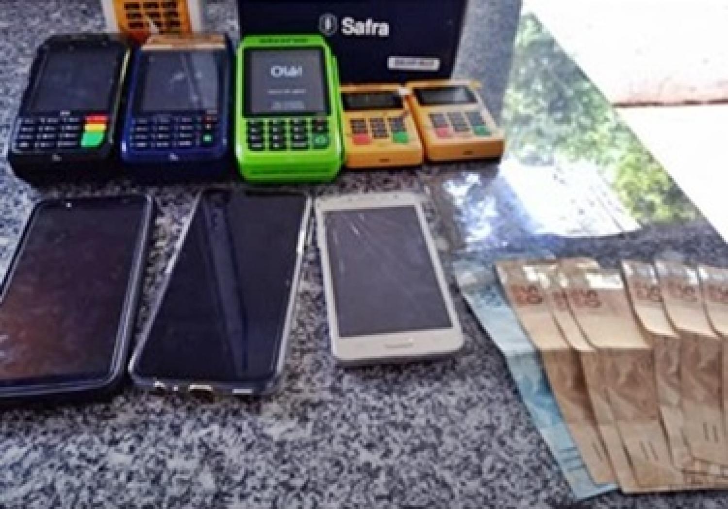 O veículo foi encaminhado para averiguação onde no porta luvas foram encontradas cinco máquinas de cartão de crédito, 1,6 gramas de maconha e R$ 400,00 em dinheiro.