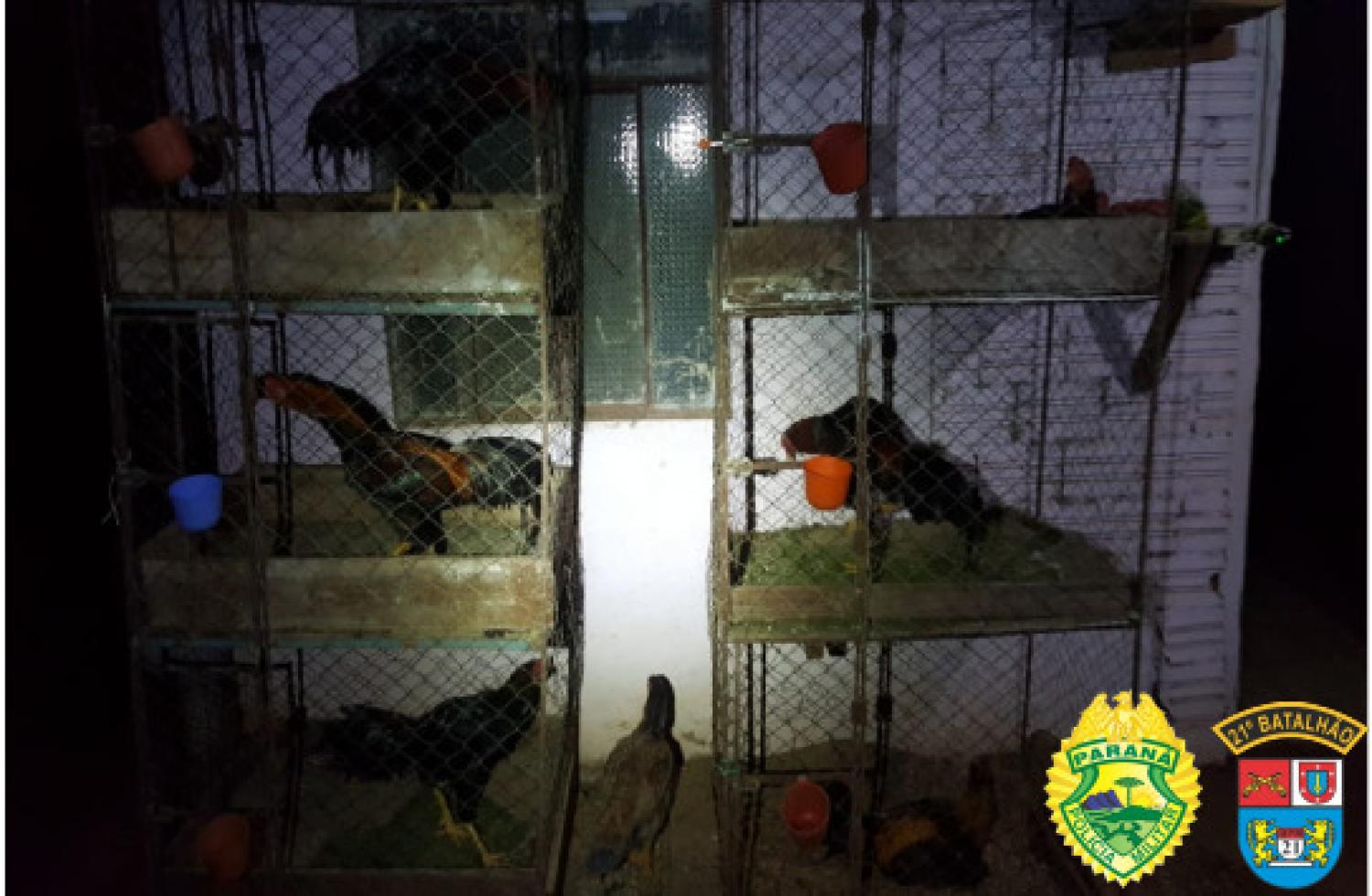 No galpão ao lado da casa, os abordados estavam fazendo um churrasco e uso de bebidas alcóolicas e ocorrendo rinha de galos, com vários apetrechos e medicamentos para as aves, e ainda cerca de 22 galos presos em gaiolas.