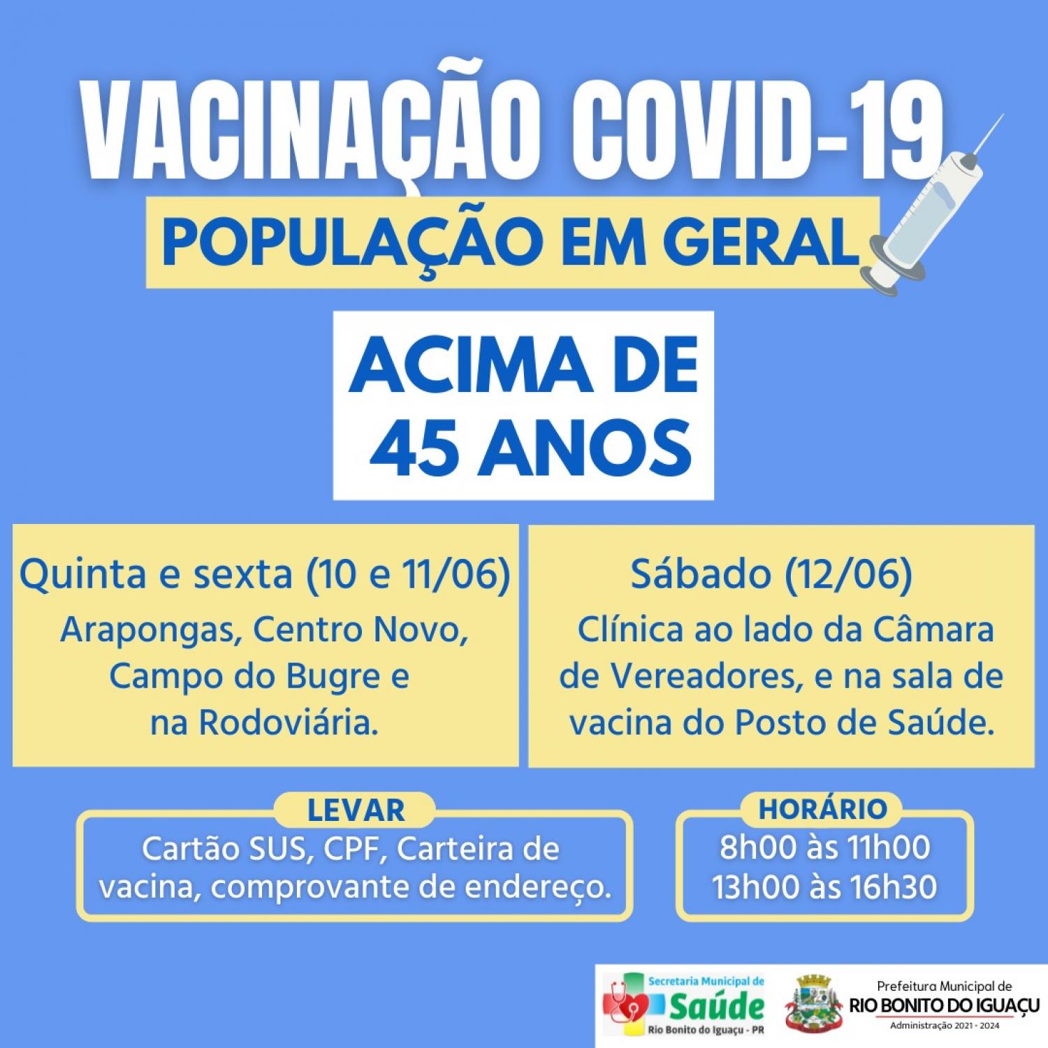 A secretaria de saúde de Rio Bonito do Iguaçu também estará vacinando nesta sexta-feira (11) durante todo o dia e sábado (12) também durante todo o dia, no horário das 08:00 hs às 11 horas e, das 13hs às 16h30min.