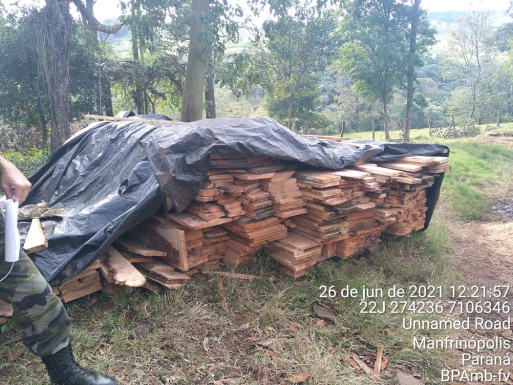 A equipe da Polícia Ambiental apreendeu no sábado (26), em uma propriedade na zona rural em Manfrinópolis, 61 metros cúbicos de madeira nativa, entre troncos de árvores, material lenhoso e tábuas beneficiadas.