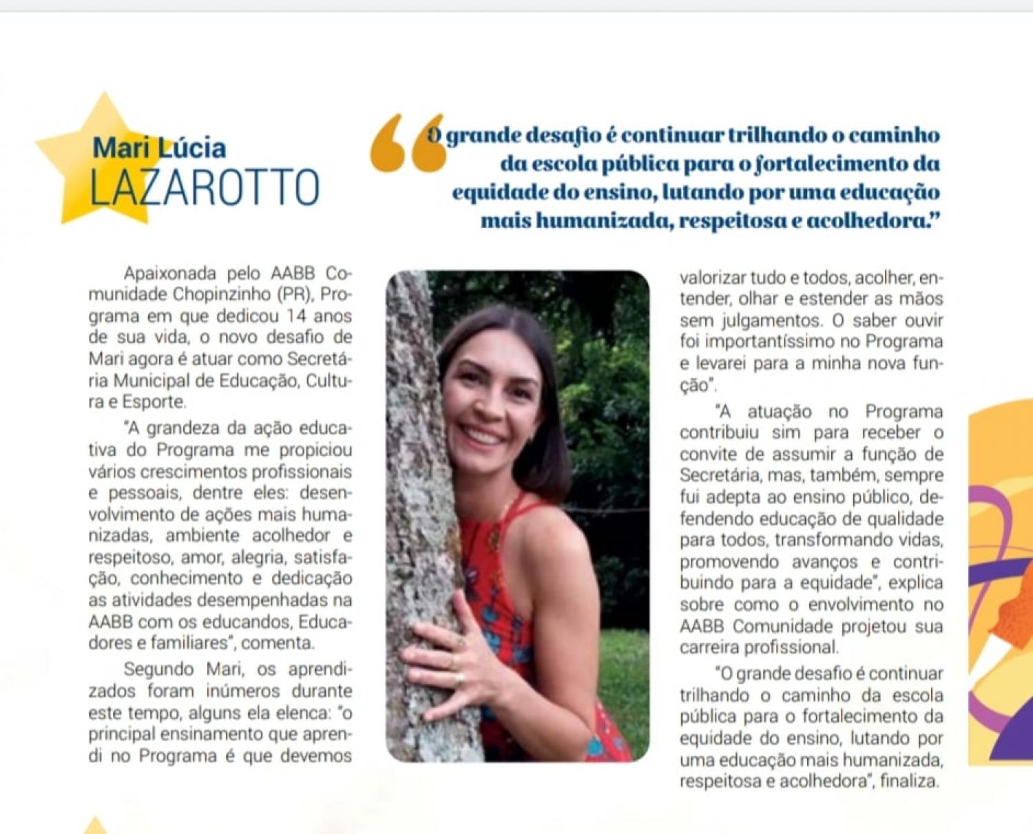 A Secretária Municipal de Educação, Cultura e Esporte de Chopinzinho, Mari Lúcia Lazarotto, foi reconhecida nacionalmente neste mês de junho através do Jornal do Educador – AABB Comunidade Educação para o futuro. A edição traz histórias de Coordenadoras do AABB Comunidade que assumiram novos desafios em seus municípios.