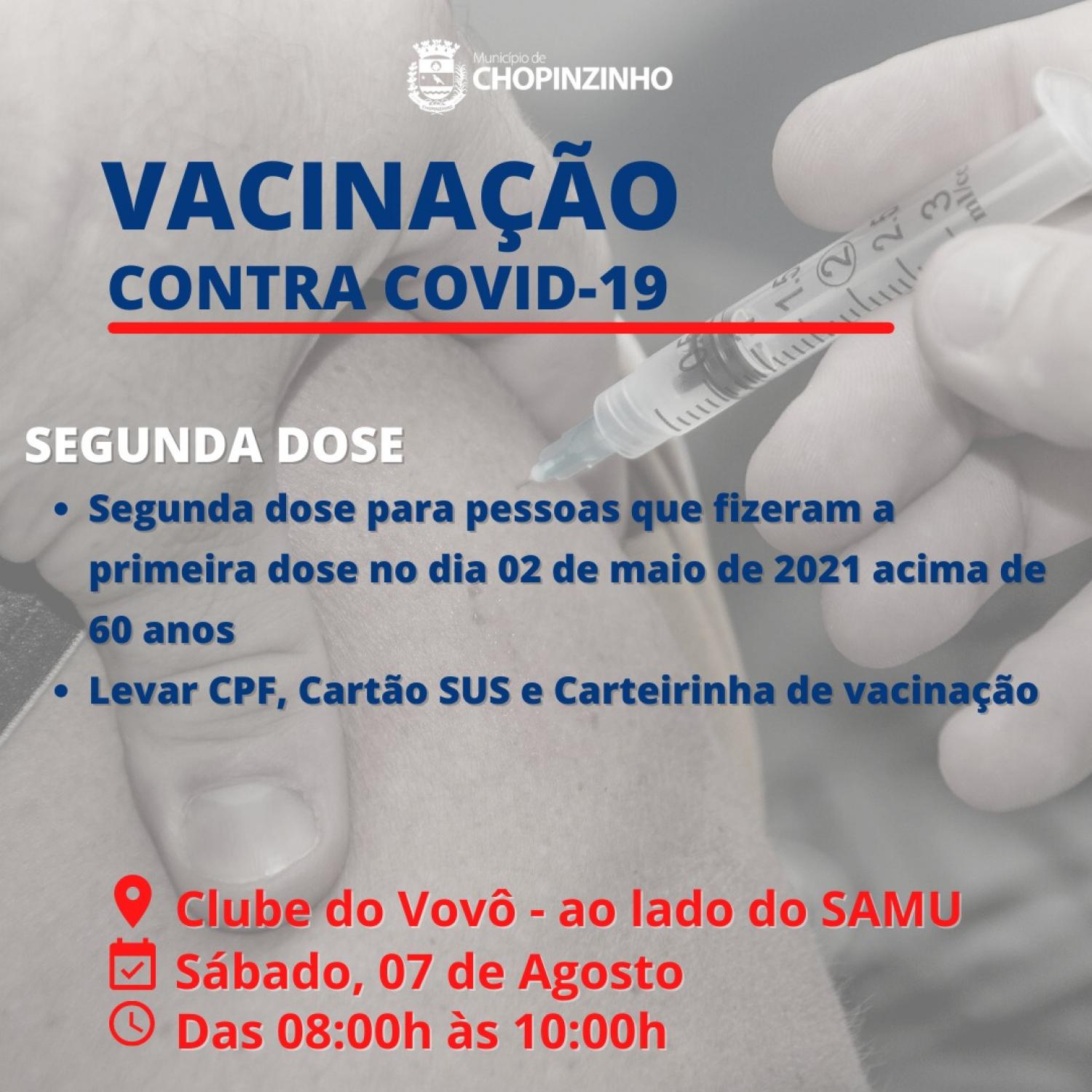 A secretaria de saúde de Chopinzinho realiza neste sábado, dia 07, a vacinação da segunda dose para pessoas com 60 anos de idade que fizeram a primeira aplicação no dia 02 de maio.