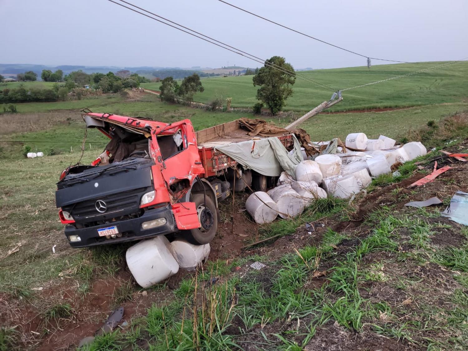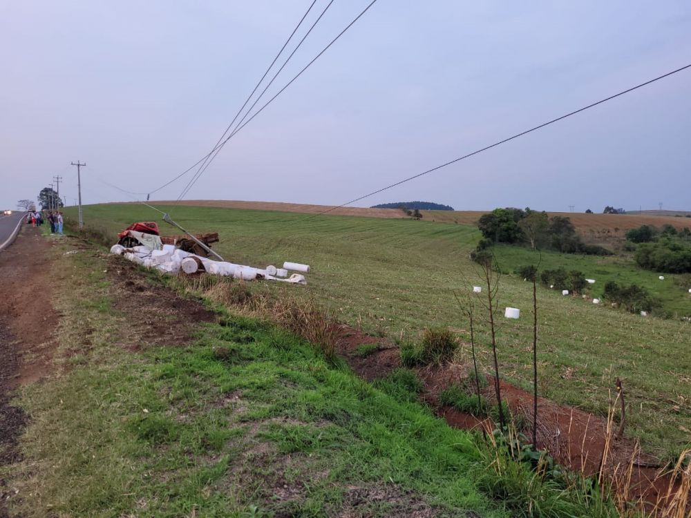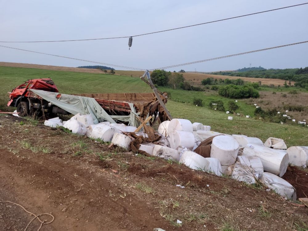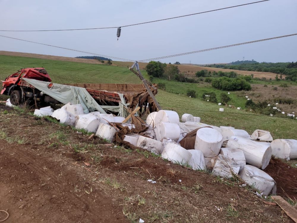 Um caminhão com placas de Agua Clara-MS, carregado com bobinas de papel, seguia sentido Chopinzinho à Saudade do Iguaçu, quando o condutor Celso Zanoni, 57 anos, perdeu o controle em uma curva, atingiu um poste da alta tensão e tombou o caminhão.