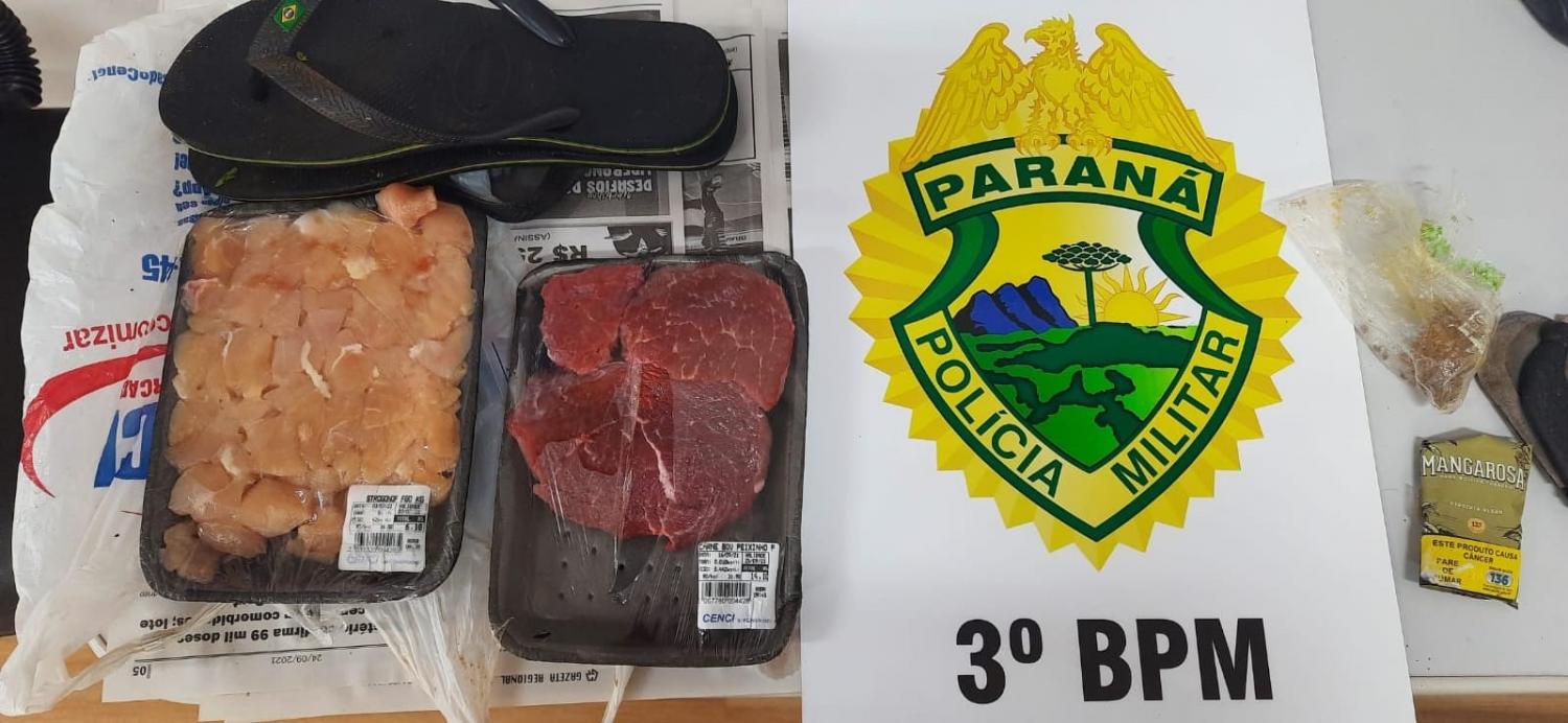 Durante a abordagem foi localizado com o detido, as bandejas de carne e o chinelo que foram reconhecidos pela vítima. O telefone celular não foi encontrado.