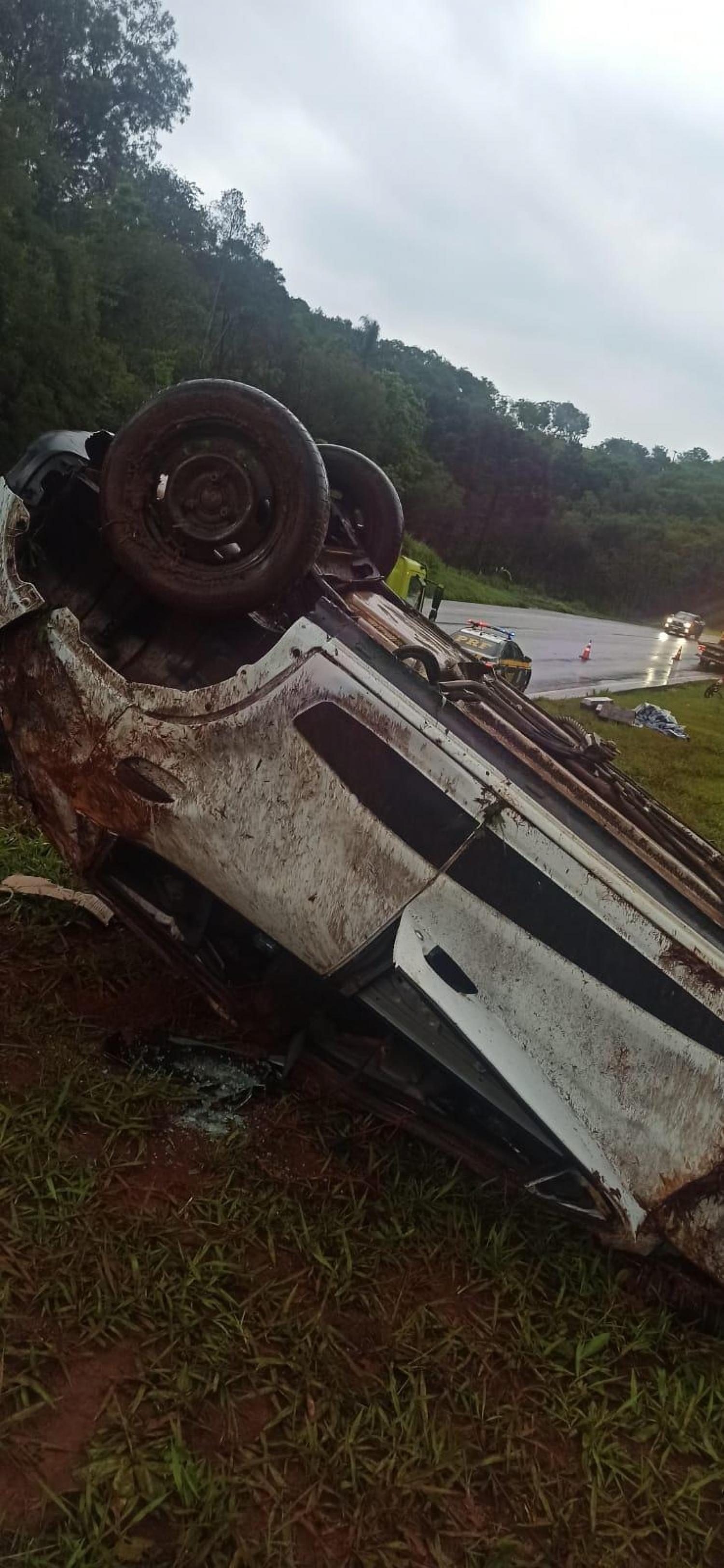 Ao chegar no local, constatou-se que o veículo RENAULT/KWID ZEN 10 MT, cor branca e estava capotado às margens da rodovia sentido Curitiba e que o condutor evadira-se do local.