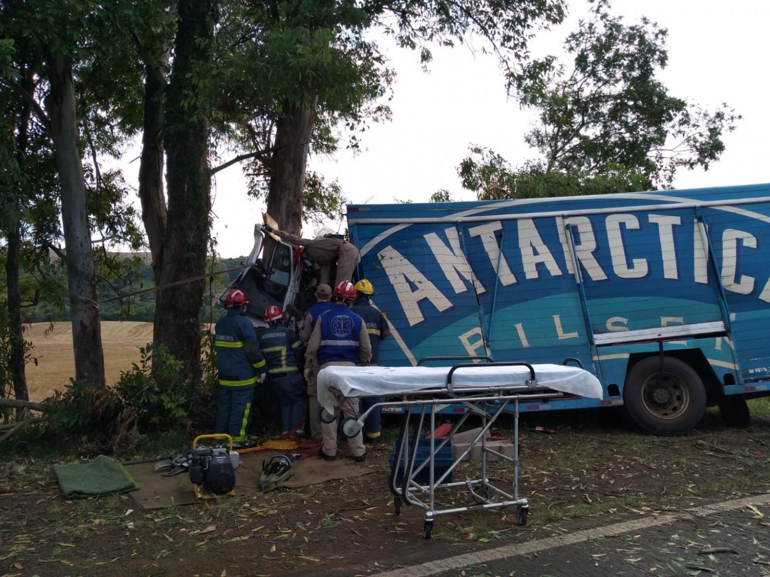 Um caminhão de transporte de bebidas seguia sentido ao Rio Tuna, quando em uma curva o condutor, saiu da pista e foi de encontro a uma árvore. O passageiro sofreu ferimentos e foi socorrido pelo SAMU.