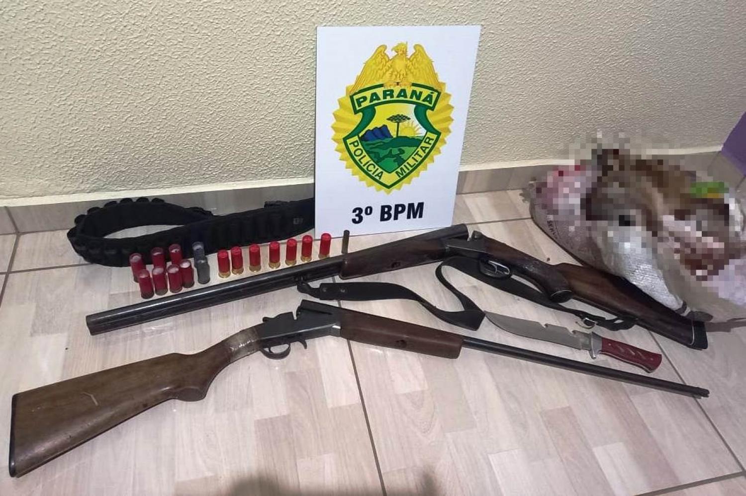 Em seguida foi dado voz de abordagem, sendo identificado o condutor, e passageiro, sendo que ambos estavam sem capacete, em consulta ao sistema a documentação está em dia, realizado busca pessoal, em ambos sendo que foi encontrado no bolso de um dos abordados, 03 cartuchos CBC, cal.12, deflagrados, 01 faca medindo lamina 19 cm de comprimento e 3,5 cm de largura,. Também foi encontrado no local pelos policiais uma espingarda cal. 36, marca BOITO, municiada com 01 cartucho intacto, e uma espingarda cal.12 marca BOITO, municiada com 02 cartuchos intactos, e uma cartucheira com 16 cartuchos CBC, cal 12, intactos, e uma bolsa com 03 lebres já abatidas, e 01 lanterna. Foi dado voz de prisão para ambos os abordados.