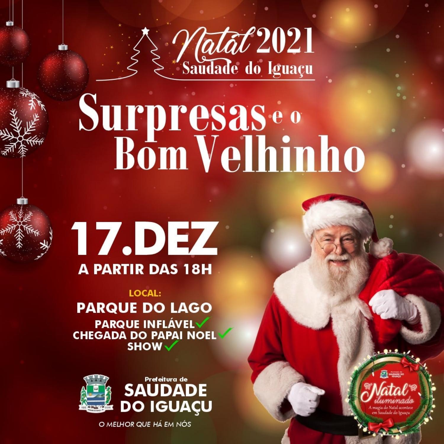 Nesta sexta-feira, dia 17, terá continuidade a programação do Natal Iluminado de Saudade do Iguaçu. A administração Municipal, através do prefeito Darlei Trento, convida toda a comunidade para participar nesta sexta-feira, dia 17, a partir das 18 horas das atrações que estão programadas.