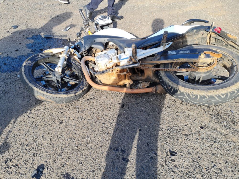 Doa acidente resultou em danos de média monta na moto e no veículo e ferimentos nos dois ocupantes, sendo que aparentemente o condutor da moto se feriu com mais gravidade.