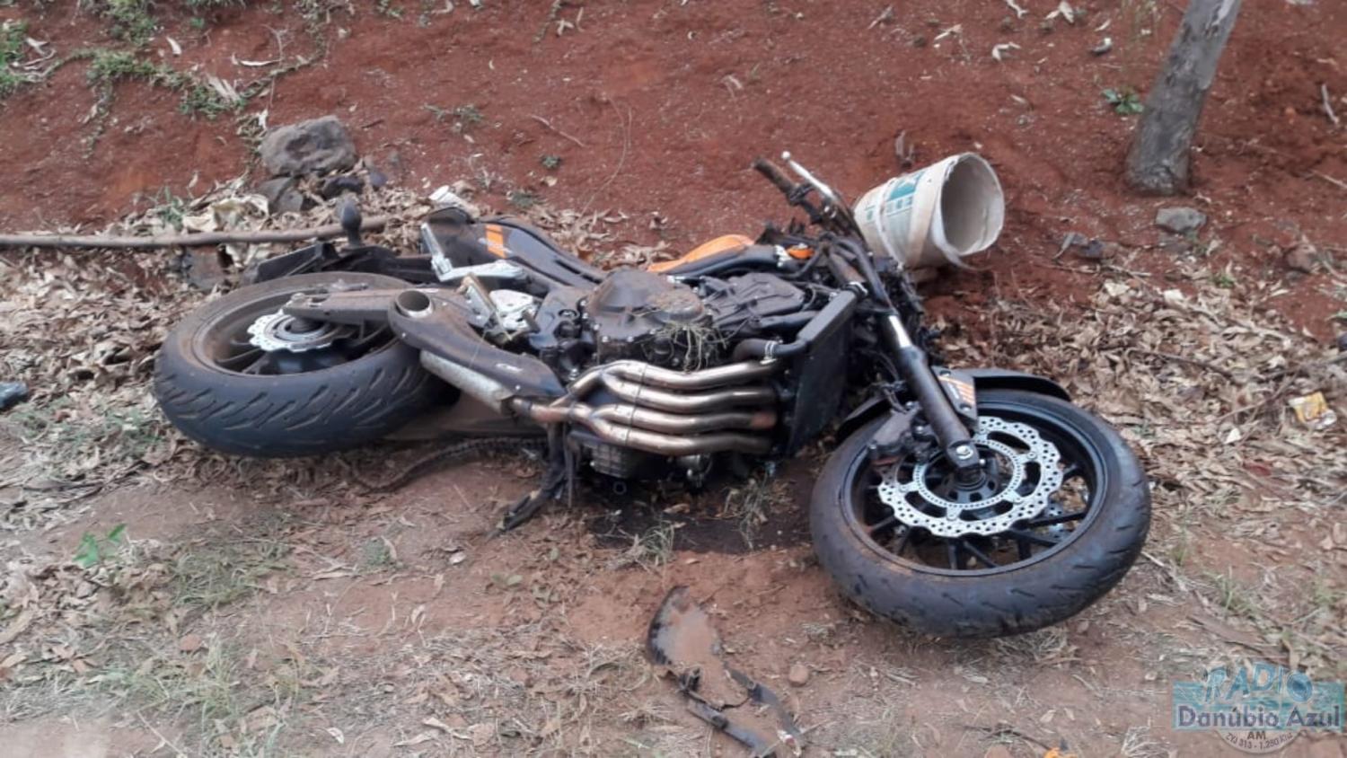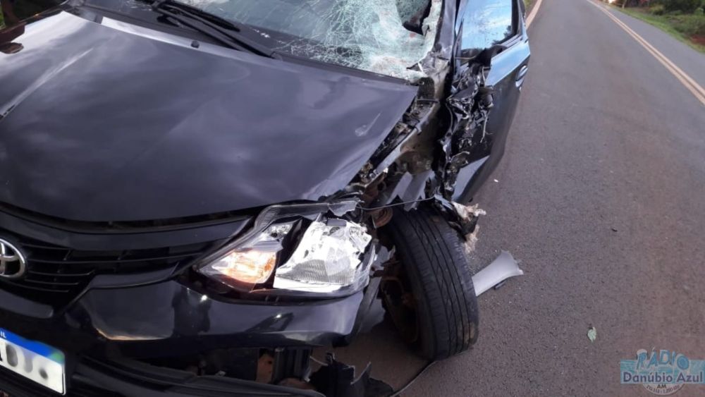 A colisão frontal envolveu uma moto CB 650 F placa mercosul e um carro Etios Toyota, placas mercosul.
