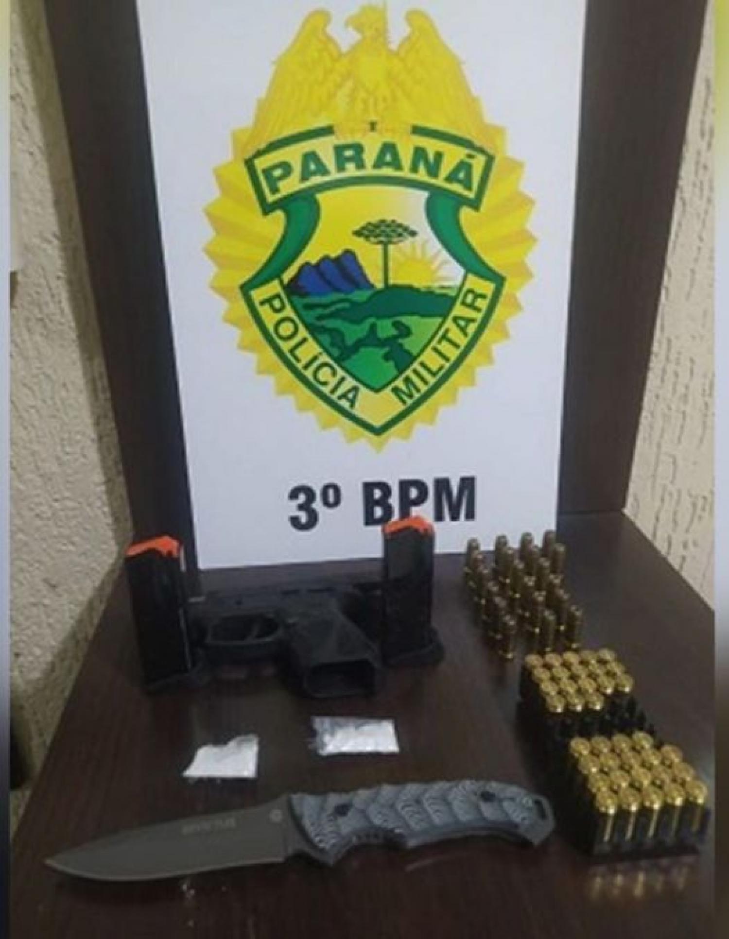 O veículo foi abordado pela equipe policial, sendo que no interior foi localizada uma pistola marca Taurus, calibre .40, com dois carregadores municiados, uma caixa com 19 cartuchos intactos e 18 deflagrados, uma faca e duas buchas de cocaína que totalizaram 6,5 gramas.