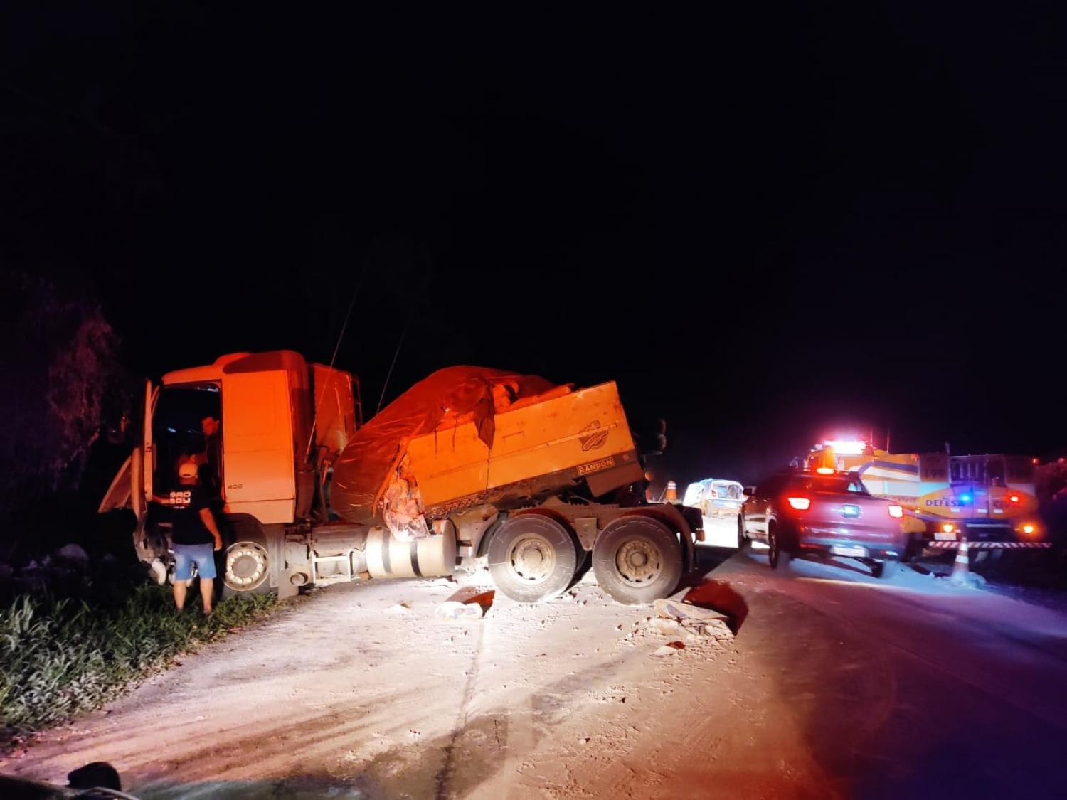 Em razão da violência do choque entre os veículos, um dos semirreboques do Bitrem acabou tombando e sua carga de cal ficou espalhada sobre a pista, interditando totalmente a faixa sentido Nova Laranjeiras/Guaraniaçu.