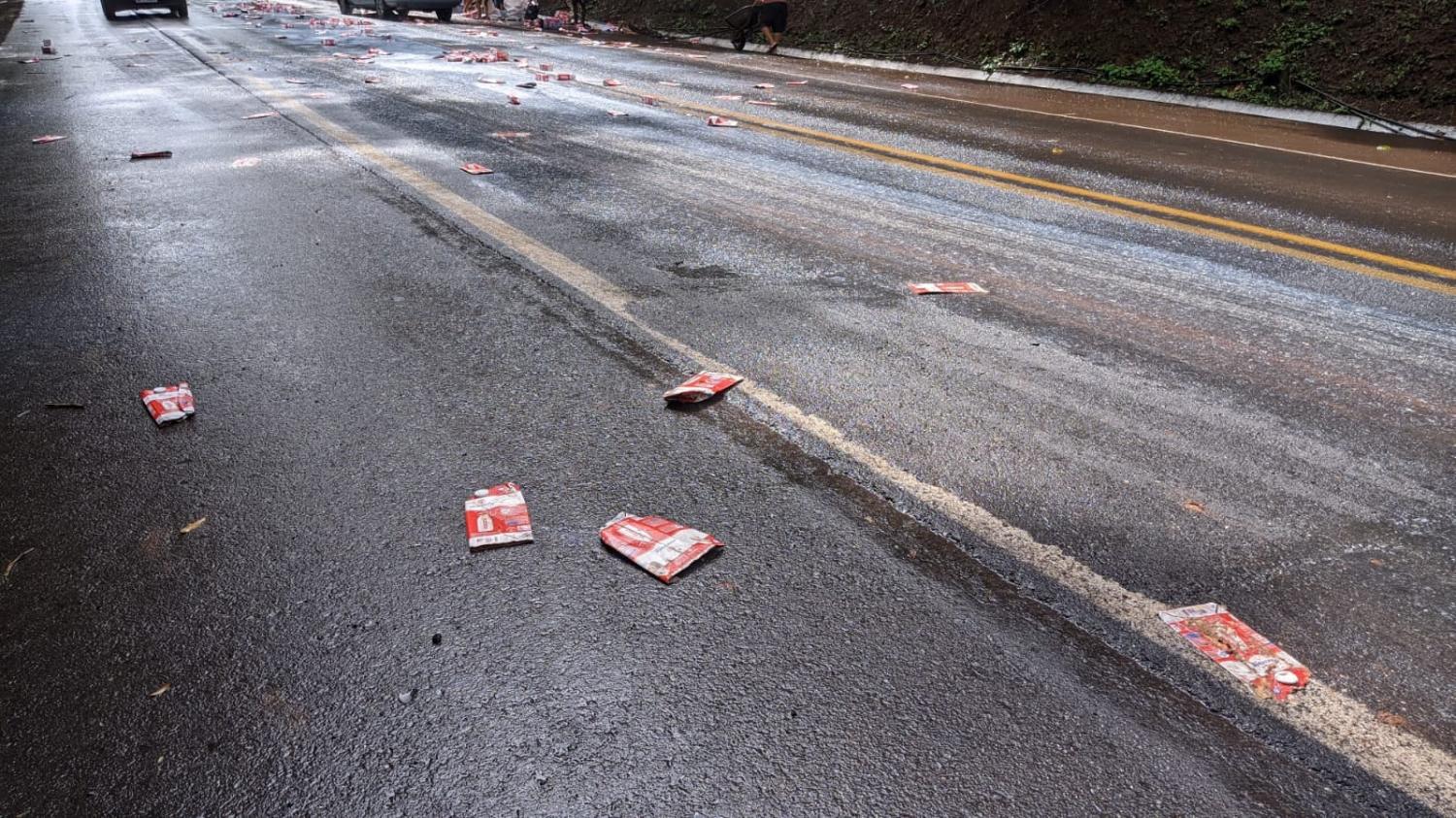 Na tarde desta segunda-feira, nossa equipe de reportagem flagrou várias caixas de leite espalhadas no meio da pista, na BR-373, mais precisamente na região dos Acampados na comunidade do Alto Pinhal.