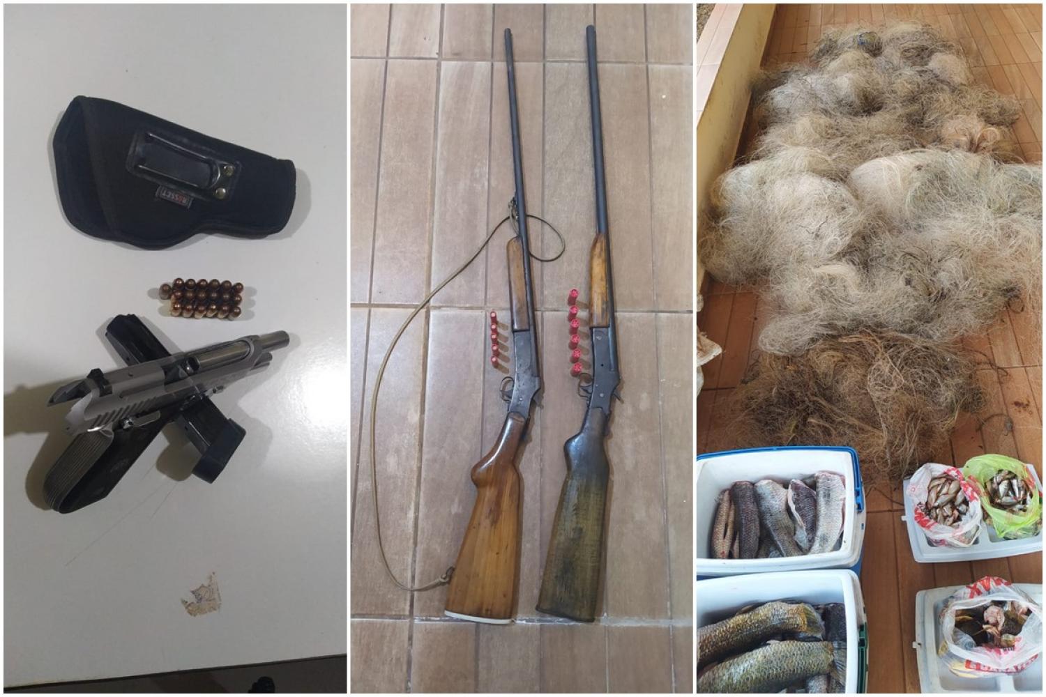No domingo (20) os policiais realizaram abordagem em um acampamento de pescadores, onde encontraram e apreenderam 10 Kg de peixe de espécies nativas, 450 metros de redes, duas espingardas calibres 28 e 36 e ainda 11 munições. Dois homens foram presos em flagrante e vão responder por porte de arma e pesca predatória. Além dos crimes, terão de pegar multa no valor de R$ 12 mil.