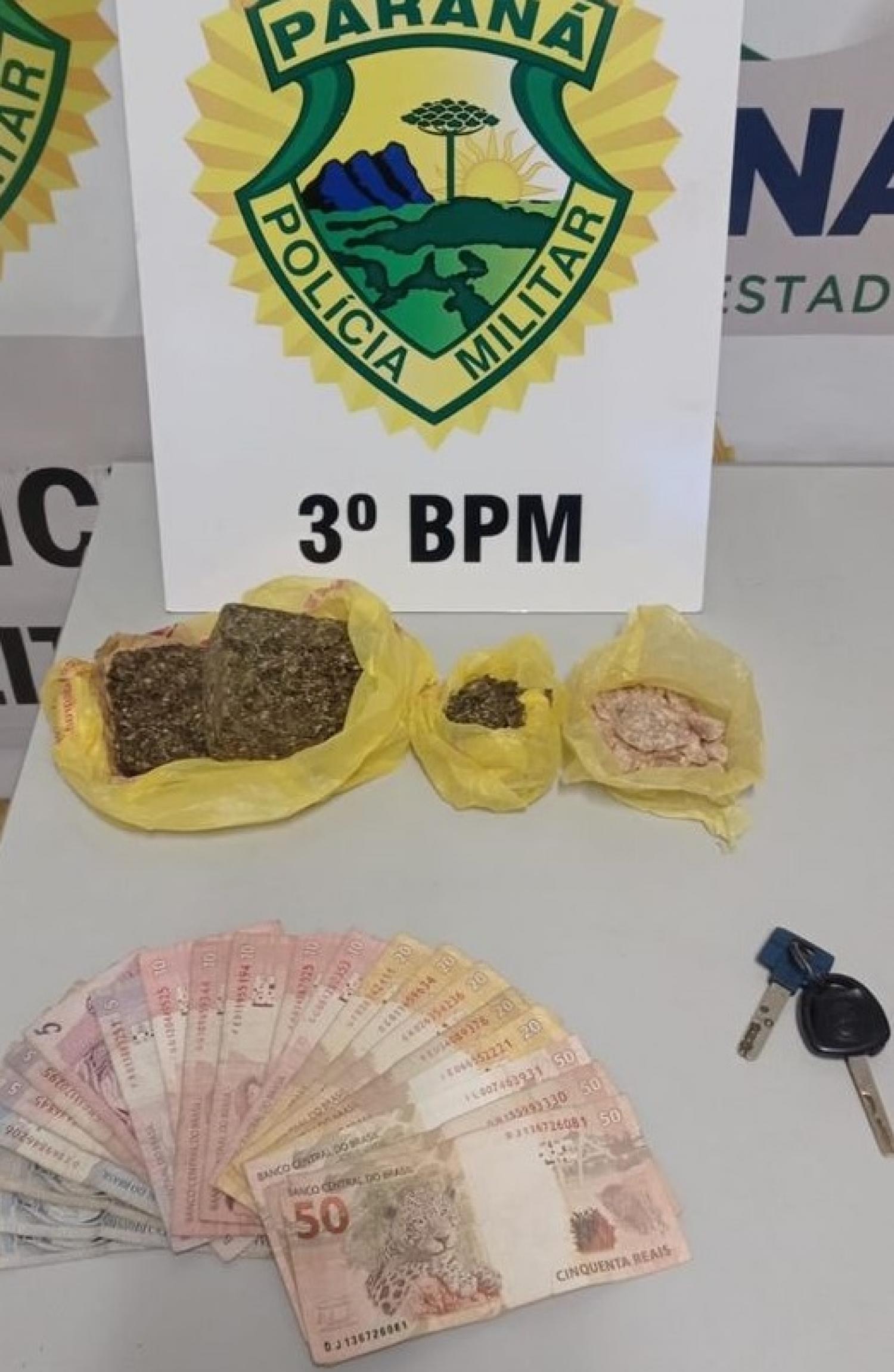 Por volta das 17h30min, equipes policiais militares realizaram bloqueio na rodovia PR 281, entre os municípios de São João e São Jorge D’Oeste-PR, abordaram o veículo GM/Vectra, conduzido por um indivíduo (26) e um adolescente (17), e em buscas no automóvel foi localizada uma porção pesando aproximadamente 40 gramas de crack e R$ 338,00 em espécie.