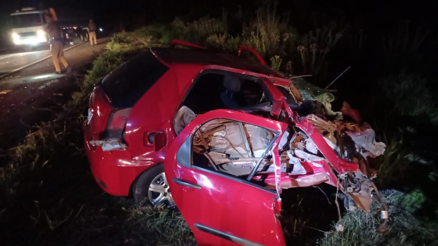 A batida envolveu um Fiat Pálio emplacado em Cantagalo e um caminhão com placas de Francisco Beltrão. Com o impacto, o caminhão tombou e o carro foi parar no acostamento, ficando totalmente destruído.