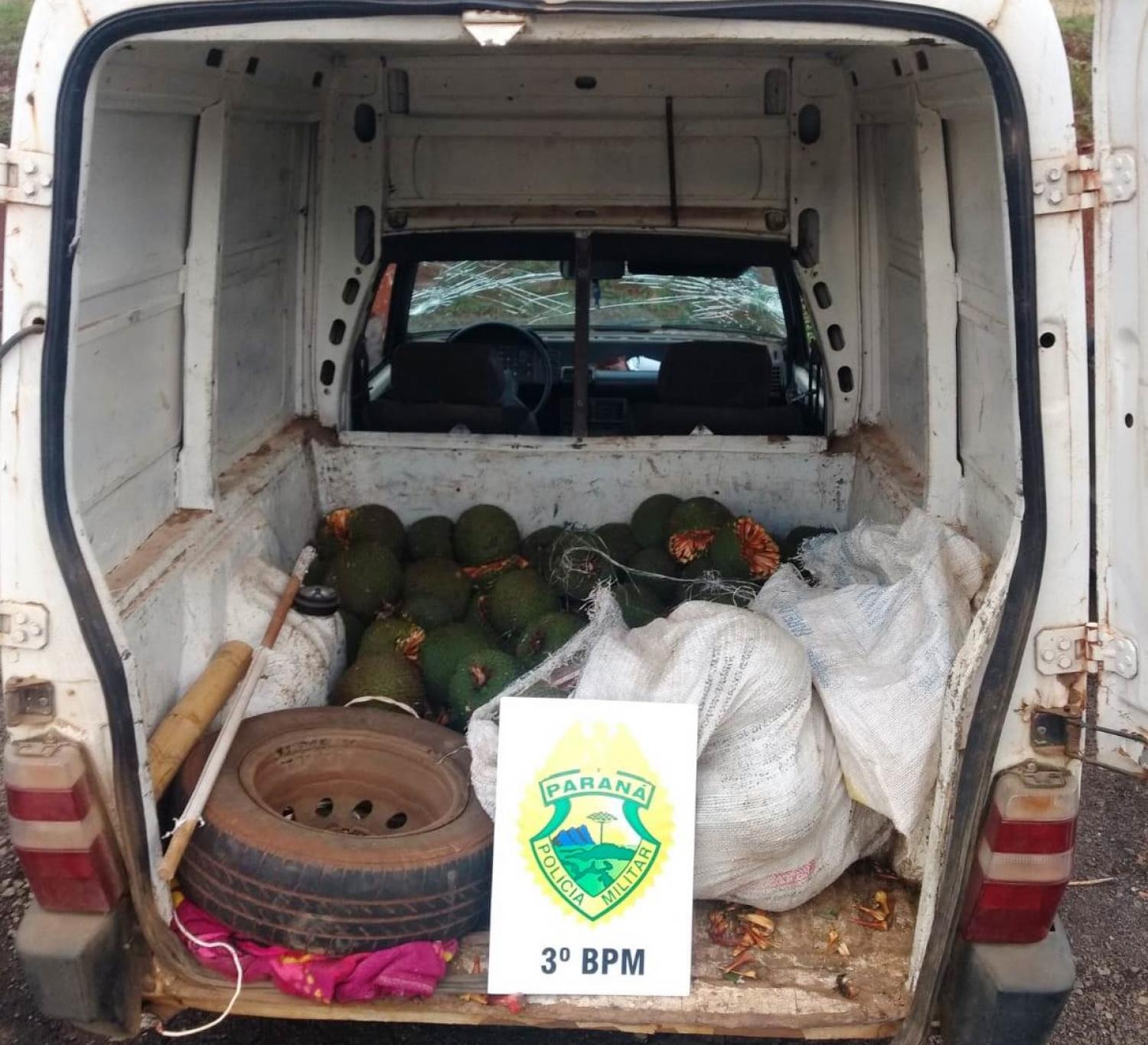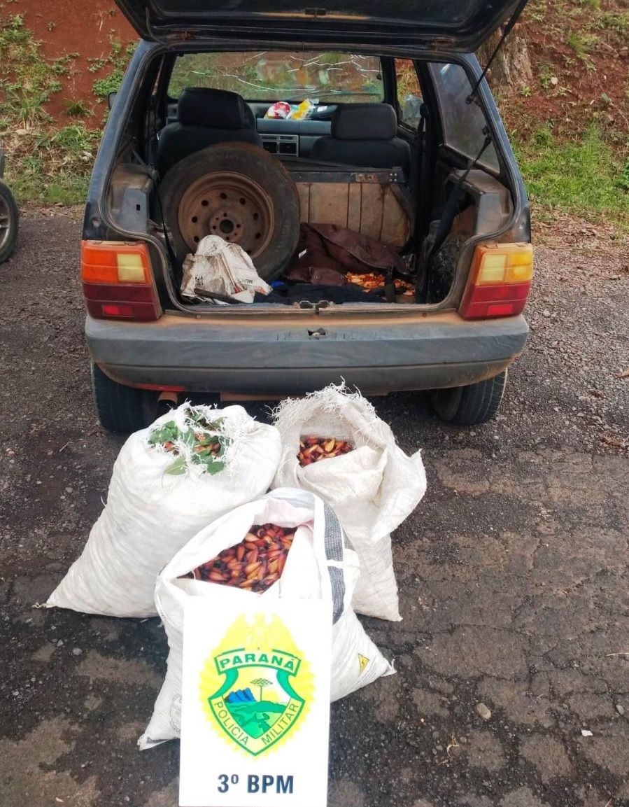 Nesta terça feira, 04, por volta das 15h30min, após denúncias via 190 da ocorrência de furto de pinhão em uma propriedade rural no município de Palmas-PR, imediatamente a equipe da Patrulha Rural deslocou para averiguar os fatos, quando em uma estrada rural avistou 2 veículos transitando em sentido contrário, sendo realizada a sua abordagem e encontrado no Fiat/Fiorino, um saco com pinhão e algumas pinhas e no Fiat/Uno, mais 2 sacos de pinhão, totalizando 120 kg de pinhão e 50 pinhas.