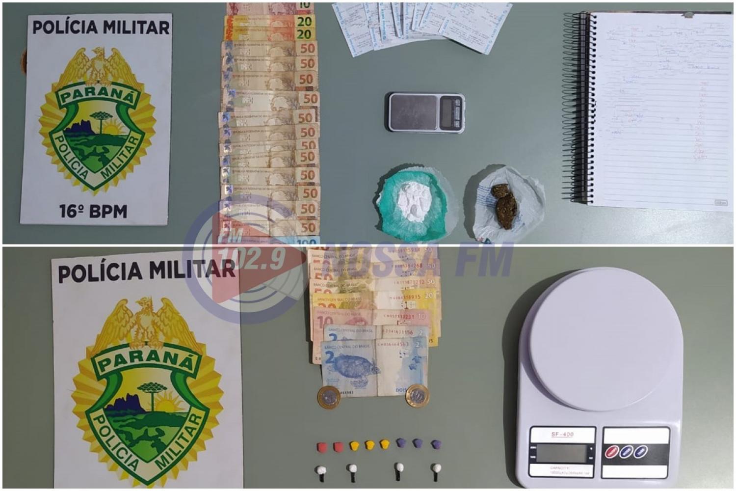 Logo em seguida, por volta das 20h30, a Polícia Militar abordou uma jovem de 19 anos conhecida por vender drogas em bares na comunidade da Paz e em Foz do Jordão. Na residência da suspeita, foram encontrados 15 gramas de cocaína, 13 gramas de maconha, uma balança de precisão, dinheiro trocado, recibos de depósitos, uma máquina de cartão de crédito e um caderno com anotações do tráfico.