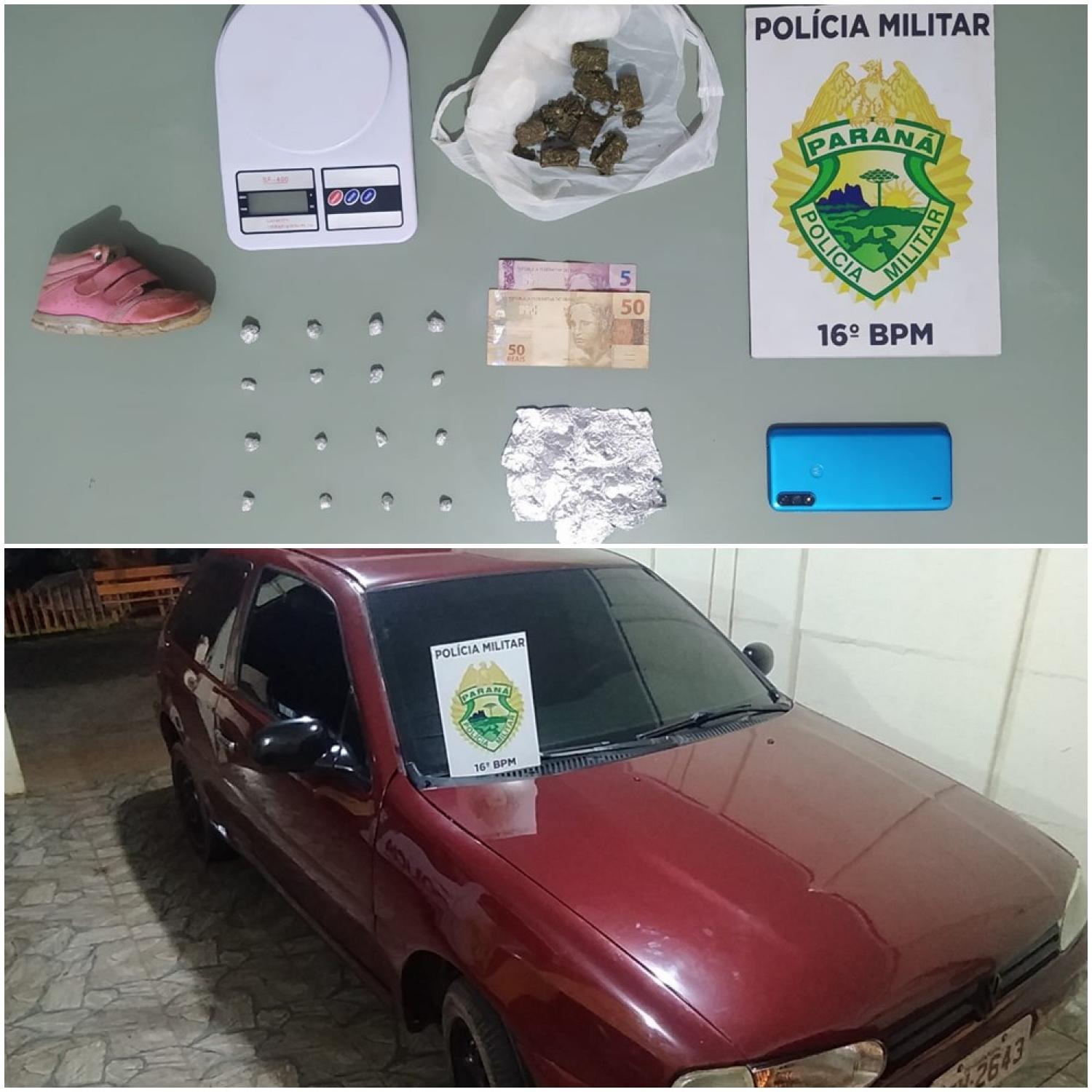 Em abordagem no local foram detidos dois homens, 24 e 27 anos. Na residência foram localizadas algumas buchas de maconha escondidas entre as roupas que estavam num berço, bem como 18 pedras de crack. Junto com as drogas foi ainda encontrada e apreendida uma balança de precisão e papel alumínio, este utilizado para embalar a droga. Quanto ao veículo Gol, os suspeitos informaram que compraram como “pizeiro”, afirmando que os autores do furto estariam no Bairro Santa Clara.