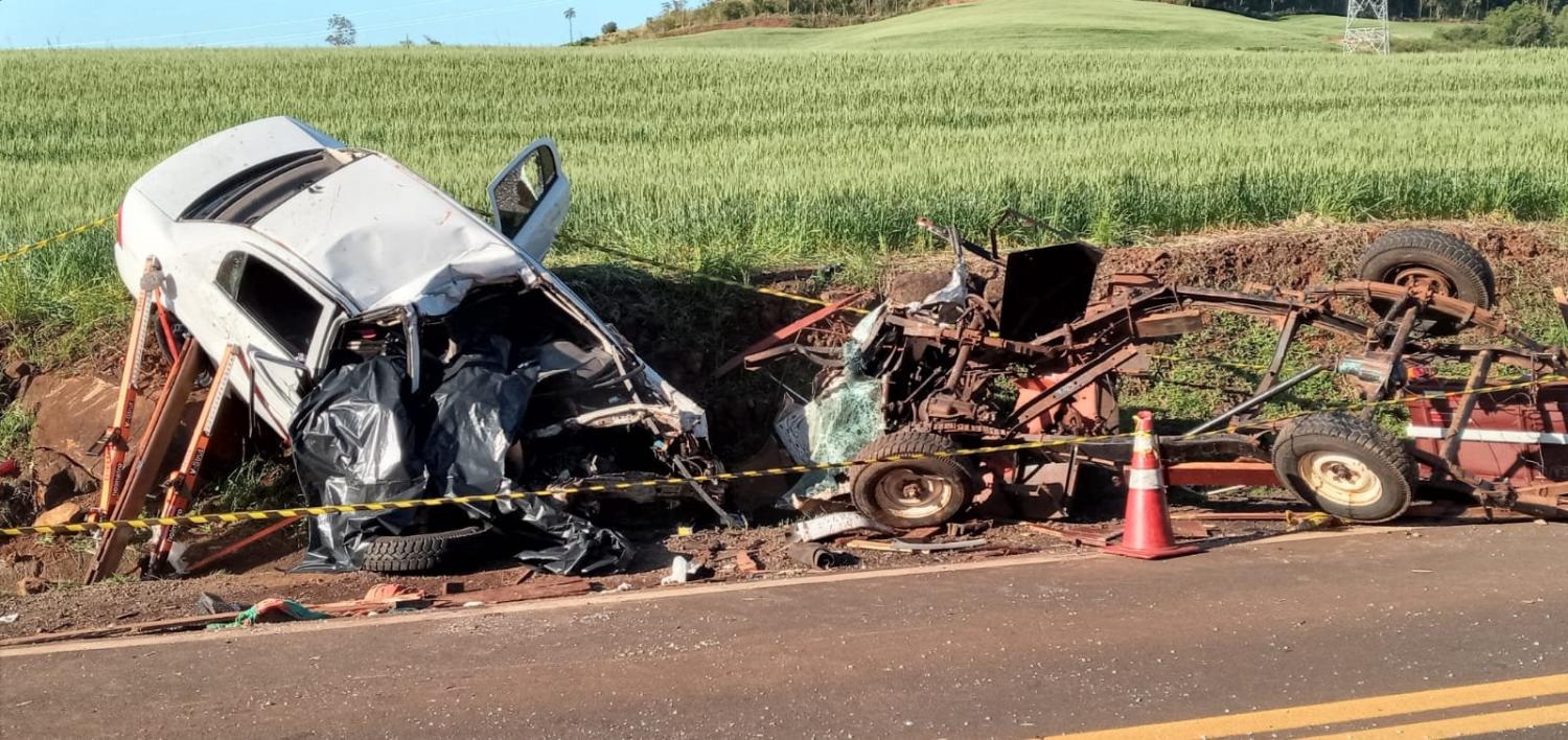 Uma colisão frontal envolvendo um Astra e uma carreta agrícola (Gerico) na tarde deste domingo (31), deixou três pessoas mortas e quatro ficaram feridas na PR-281, entre Planalto e o Distrito de São Valério. O Astra era ocupado por cinco pessoas, sendo que o motorista e a passageira vieram a óbito no local do acidente.
