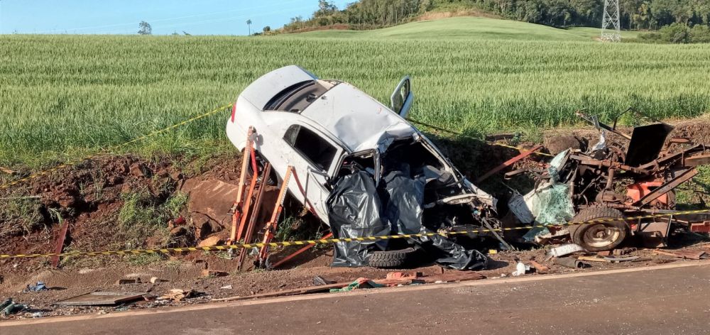 O casal foi identiofciado como Luís Fernando Muller, de 26 anos, e Adriane Manchado, de 22 anos. Além do casal, no banco traseiro havia um casal e uma criança. os três sofreram ferimentos e foram encaminhados para atendimento médico. A carreta agrícola era ocupada por um casal. A mulher, identificada como Maria Claudia Tis Moreira, de 65 anos, morreu na hora e o motorista foi socorrido a casa hospitalar.