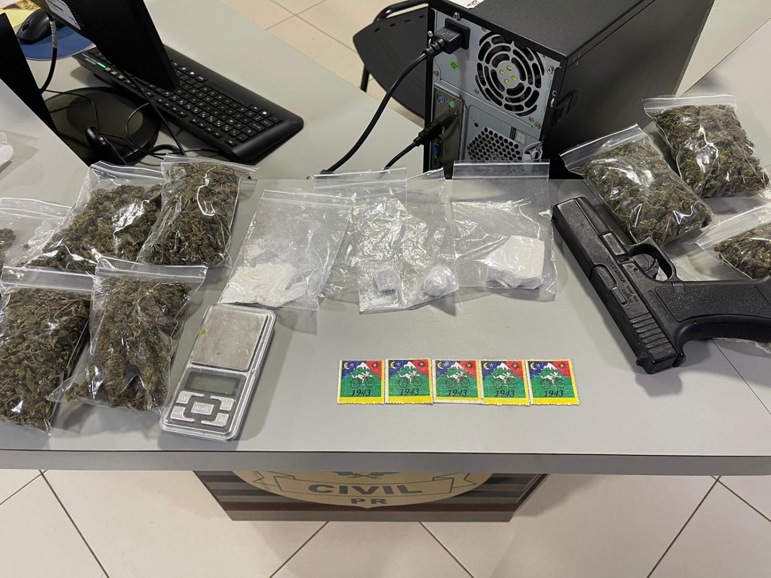 Com o suspeito foi feita apreensão de 363 gramas de maconha, 72 gramas de cocaína, 10 gramas de haxixe e 125 pontos de LSD.