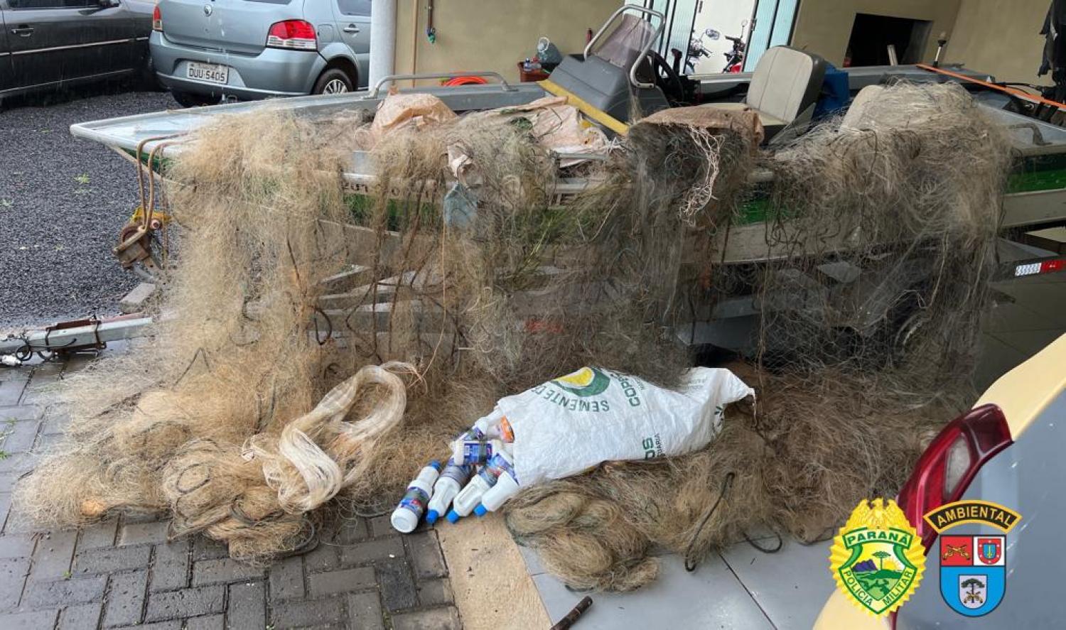 A equipe da Polícia Ambiental realizou patrulhamento aquático na região do alagado nos municípios de Saudade do Iguaçu e Rio Bonito do Iguaçu, onde durante a operação foram localizados e apreendidos diversos materiais de pesca predatória.