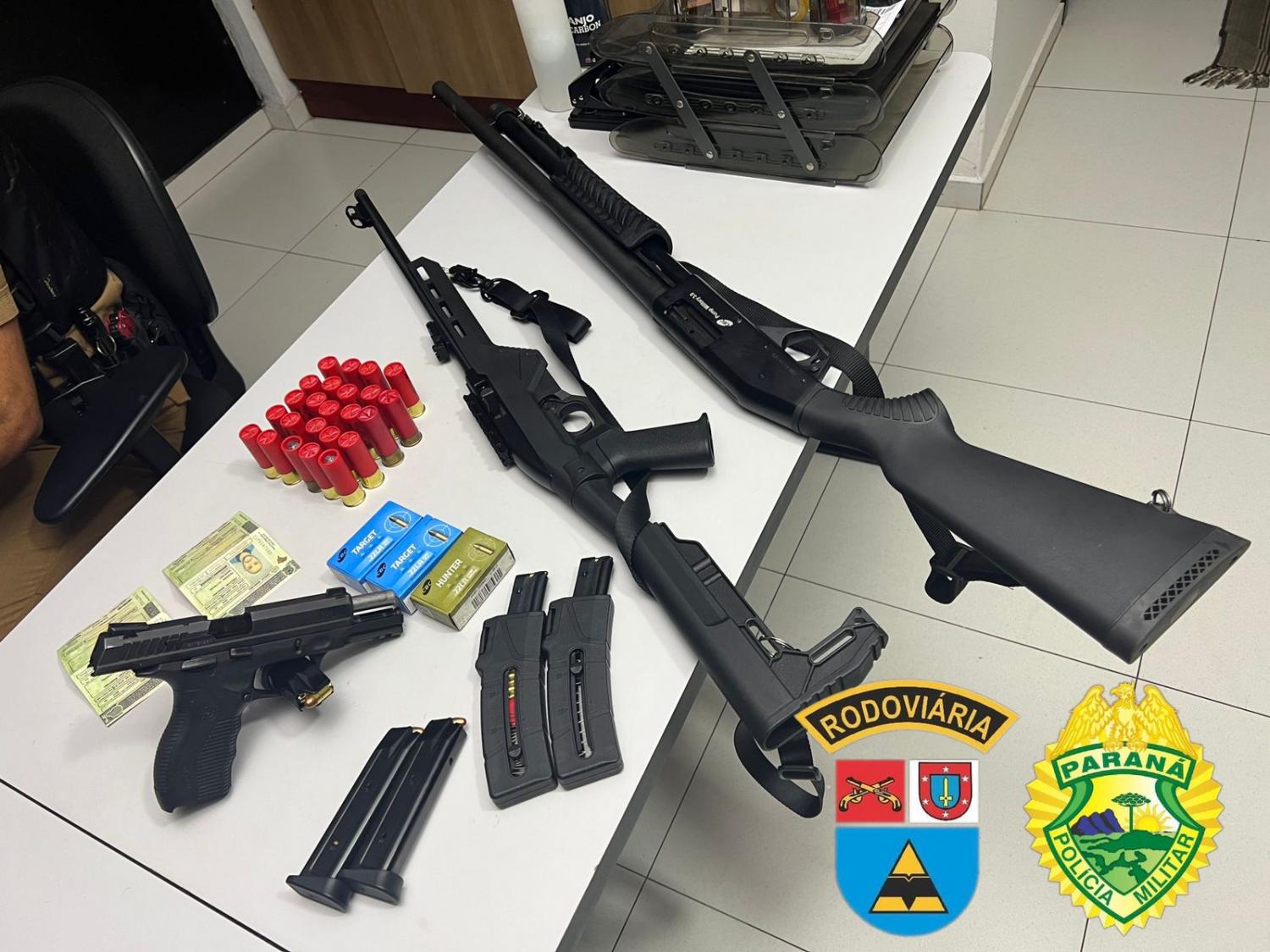 Os militares rodoviários perceberam que dois carros transitavam na contra mão de direção e realizaram a abordagem. Dentro de um Pálio Weekend foi encontrada uma espingarda calibre 12, uma pistola calibre 380, 24 cartuchos calibre 12 e 46 calibre 380. No outro carro, um Astra, foi apreendida uma carabina calibre 22 e 169 munições.