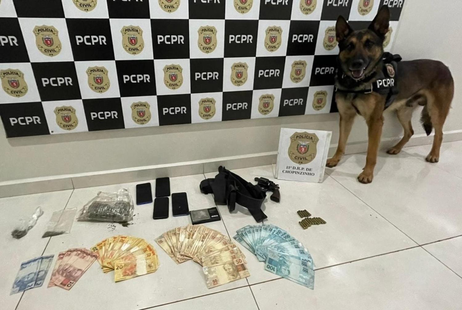 Desde então as equipes passaram a monitorar a residência do suspeito e, com base nas provas coletadas, foi solicitado mandado judicial de busca e apreensão junto ao Poder Judiciário da Comarca. O pedido, que teve parecer favorável do Ministério Público, foi deferido dando origem à operação desta quinta-feira. Na casa do suspeito, foi apreendido um revólver calibre 38, munições calibres 38 e 357, drogas, uma balança de precisão e mais de R$ 5 mil em dinheiro.