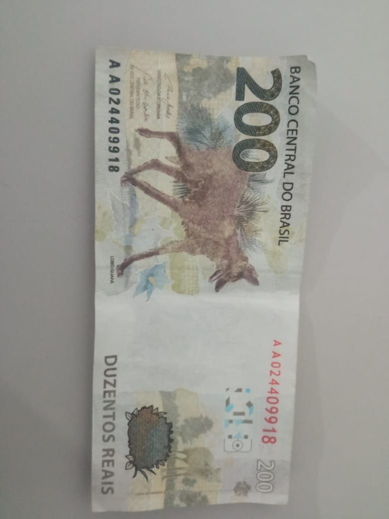 Diante disso, a equipe deslocou imediatamente à Salto do Lontra onde com apoio da Polícia Militar local, foi deslocado ao bar da suspeita onde em revista foi encontrado com ela, 01 nota de 200 reais falsa, com o irmão dela mais 01 nota de 200 reais falsa e com o filho dela mais 02 notas de 200 falsas, bem como mais uma nota que foi apreendida em Nova Prata do Iguaçu, totalizando R$ 1.000,00 (um mil reais) em notas falsas, todas com o mesmo número de série.