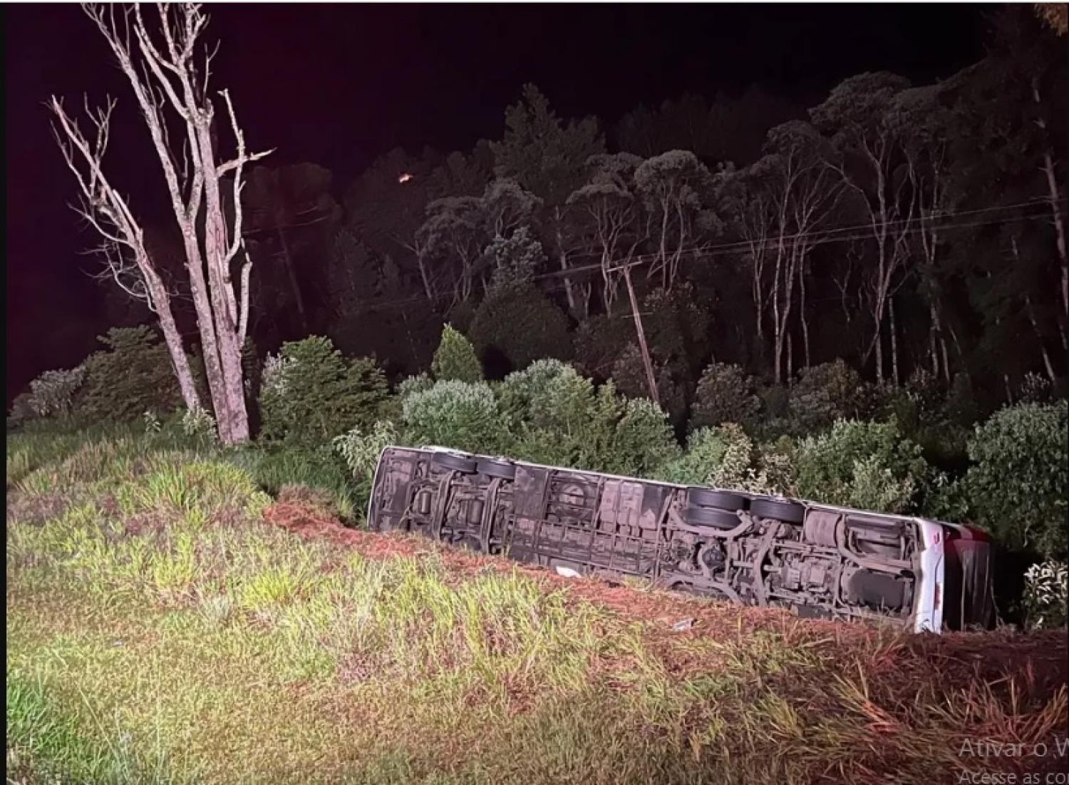 Dos sete mortos, quatro estão embaixo do ônibus, conforme o Corpo de Bombeiros. O veículo tombou após sair da pista.