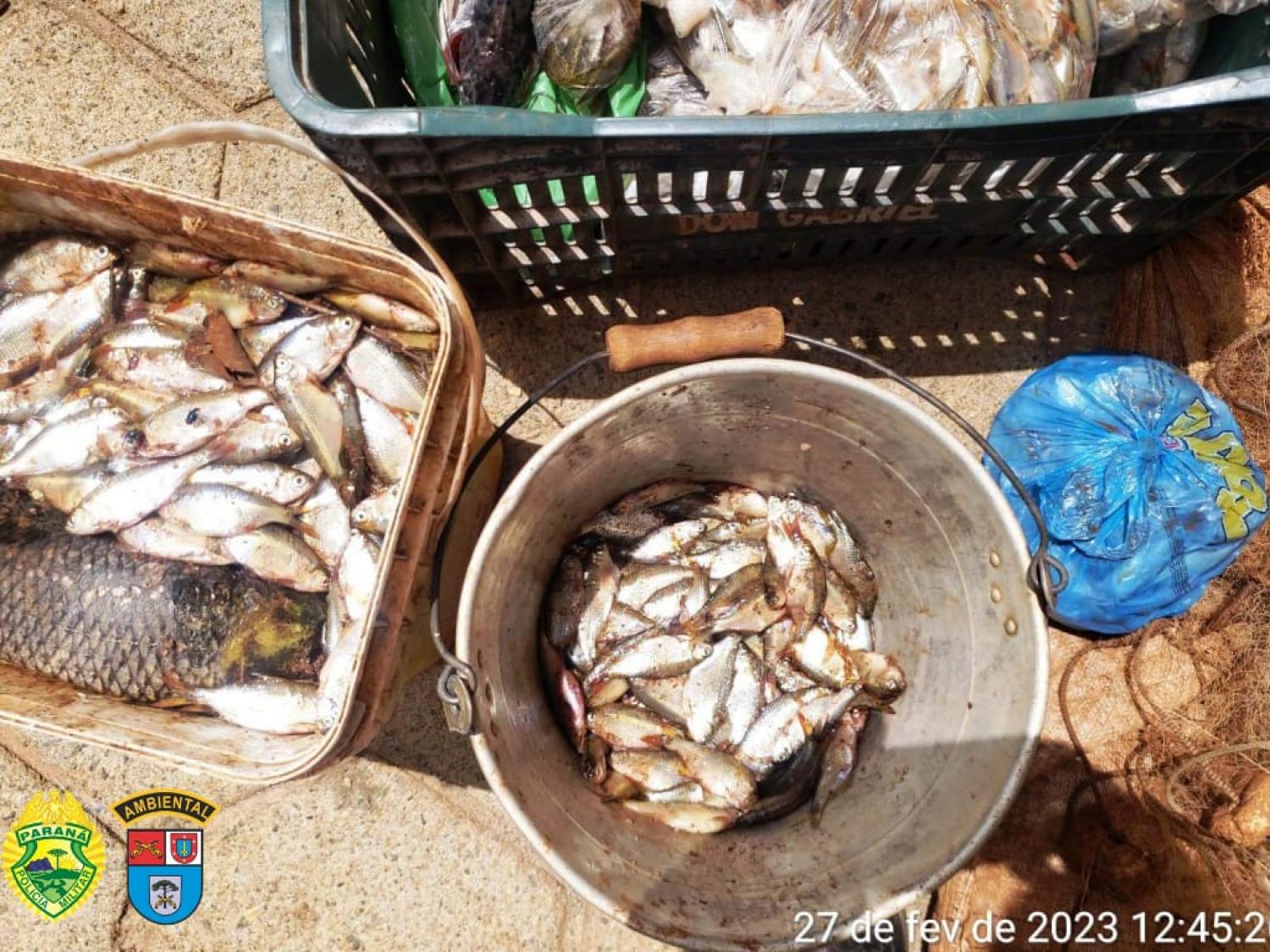 Eles ainda estavam no processo de retirada de peixes nativos da rede (traíras, bagres e lambaris) e foram detidos. Foi feita apreensão de 30 Kg de peixes e 120 metros de redes.
